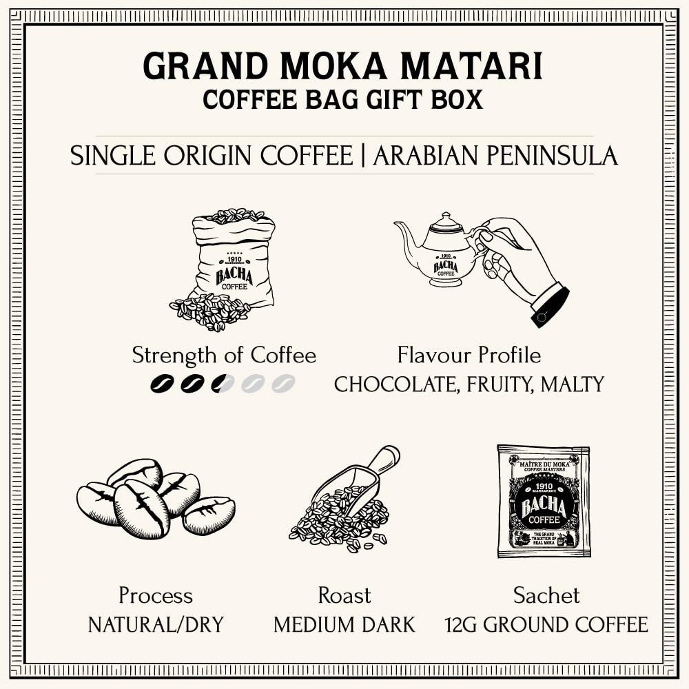 Q: What makes Bacha Coffee's Grand Moka Matari unique?A: Bacha Coffee's Grand Moka Matari is unique due to its Yemeni origin, which is known for traditional dry processing methods. This results in a full-bodied, earthy flavor with a bright acidity and sweet notes of apricot, dark chocolate, and dates.