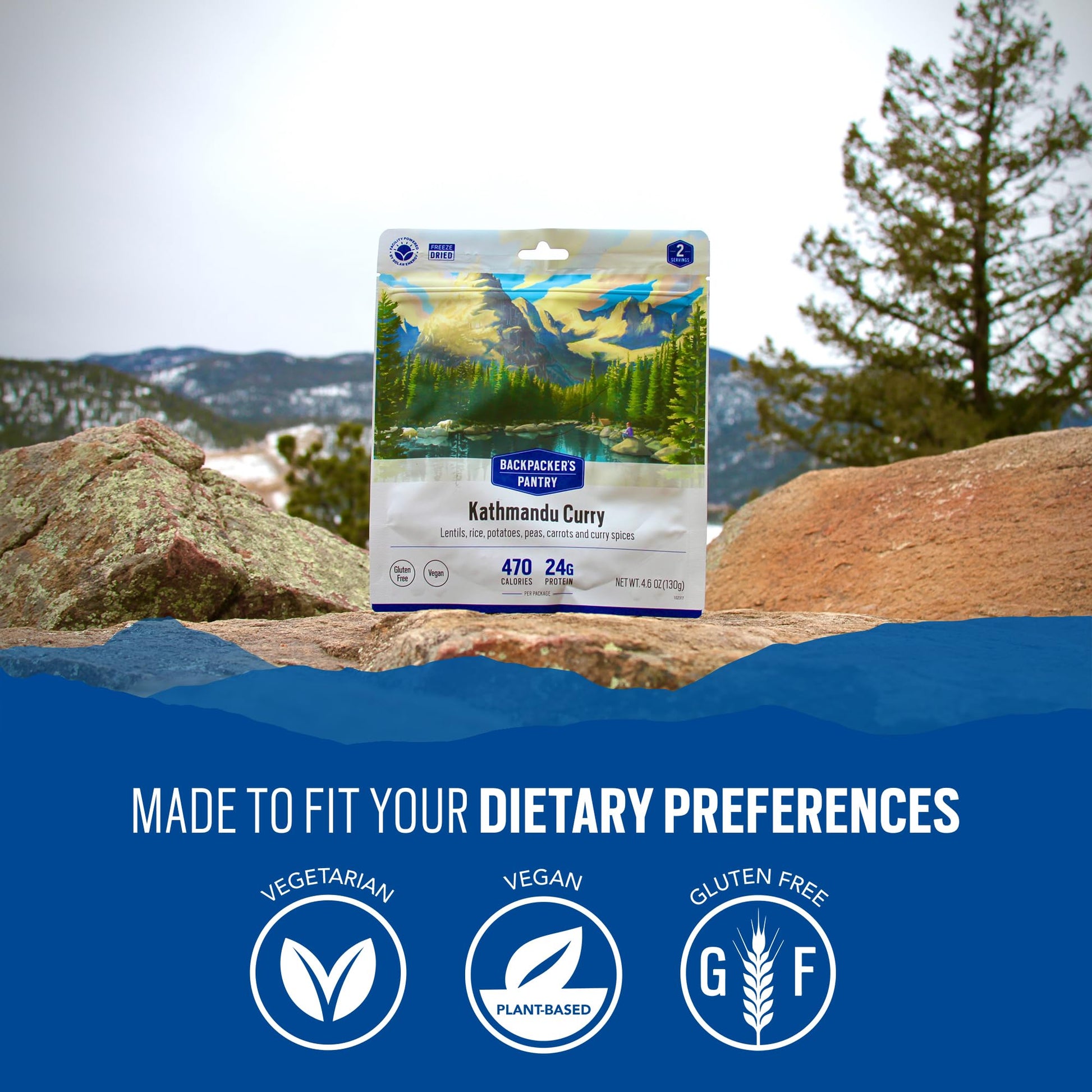 Q: What are the main ingredients in Backpacker's Pantry Kathmandu Curry?A: The Kathmandu Curry is made with lentils, brown rice, potatoes, peas, carrots, and a blend of curry seasoning, offering a hearty and nutritious meal.