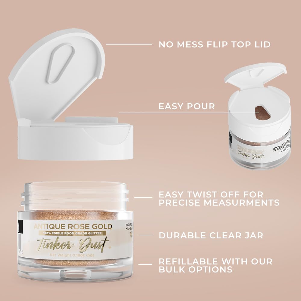 - Q: How do I apply Tinker Dust for the best results? A: For the best application, use the convenient flip-cap design of the jar to sprinkle the Tinker Dust directly onto your cakes, cupcakes, or drinks. This allows for precise control and even coverage, making it easy to achieve the desired sparkle.