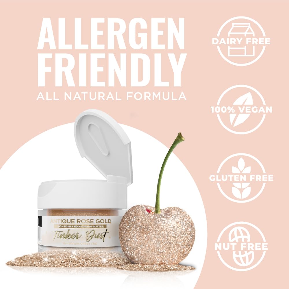 - Q: What is Bakell Antique Rose Gold Tinker Dust used for? A: Bakell Antique Rose Gold Tinker Dust is a versatile edible glitter that can be used for cake decorating, enhancing desserts, and even garnishing beverages like cocktails and mocktails. Its larger particles create a stunning glitter effect, making it perfect for various culinary applications.