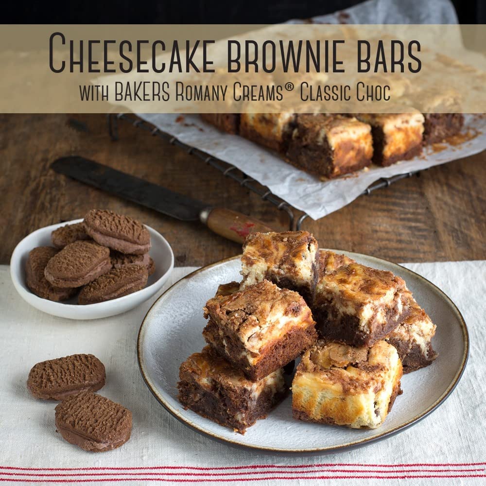 Q: What are Bakers Romany Creams made of?A: Bakers Romany Creams are made from two chocolate coconut biscuits filled with a rich milk chocolate filling. They are crafted using the finest ingredients to ensure a delicious taste.