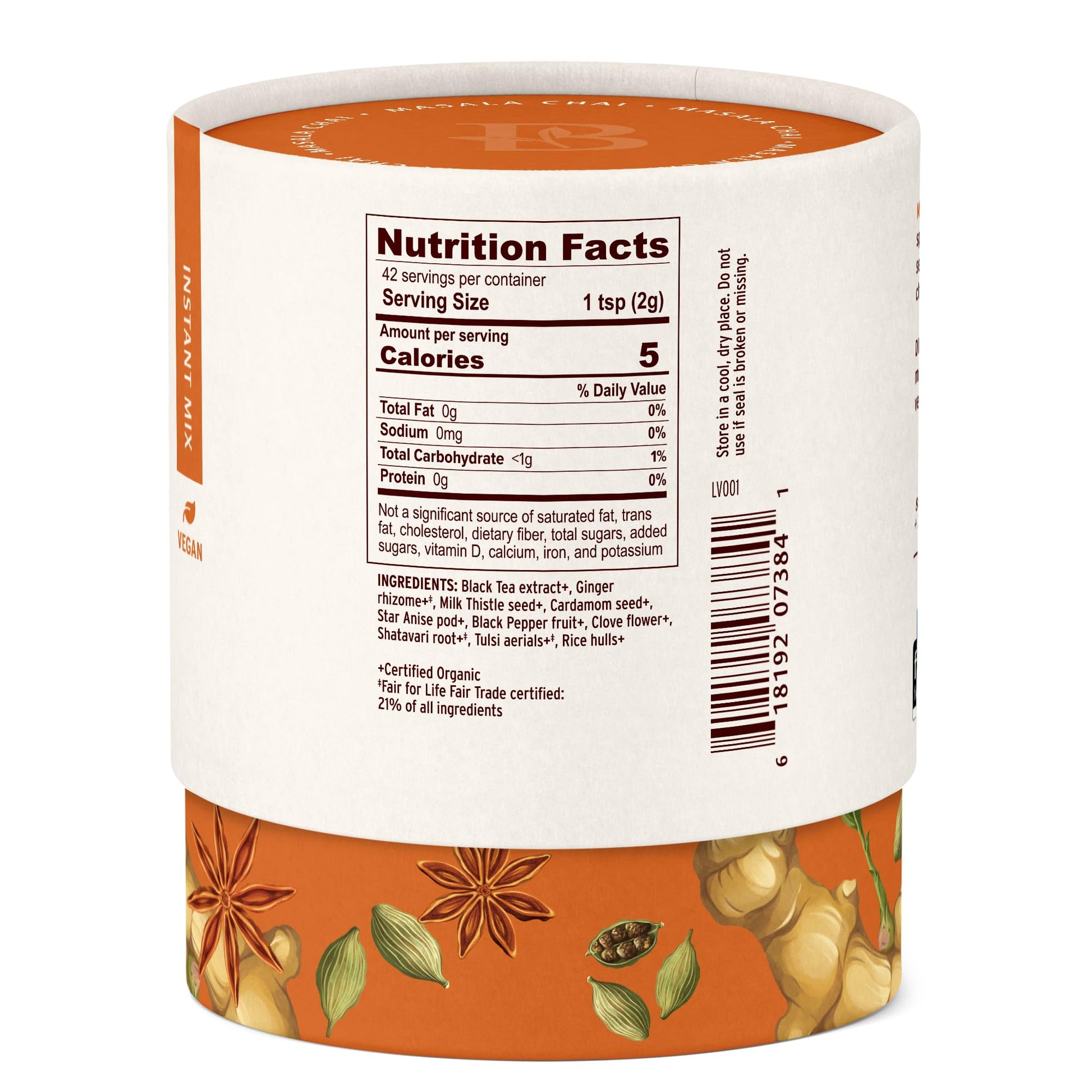 Inspired By Traditional Masala Chai, This Signature Blend Combines Assam Black Tea, Flavorful Fair Trade Spices, And Nourishing Adaptogenic Herbs. Naturally Caffeinated, It Provides A Richly Satisfying Flavor And A Boost Of Balanced Energy.* | A Unique Adaptogen Tea, Masala Chai Features Classic Spices Like Cardamom And Ginger Alongside Grounding And Energizing Adaptogenic Herbs That Counterbalance The Effects Of Caffeine, Including Milk Thistle, Tulsi Leaf, And Shatavari.* | The Perfect Blend To Activate Your Morning Or Power Your Afternoon, This Instant Mix Is Easy To Make And Even Easier To Enjoy. Simply Mix A Teaspoon Of Powder With Hot Water Or Milk And Add Your Favorite Sweetener.* | Banyan Botanicals Is Committed To Producing The Highest Quality Ayurvedic Products Using Usda Certified Organic Herbs That Are Sustainably Sourced And Fairly Traded. All Our Products Are 3Rd Party Tested To Ensure Product Quality And Safety. | The Banyan Guarantee: If For Any Reason You