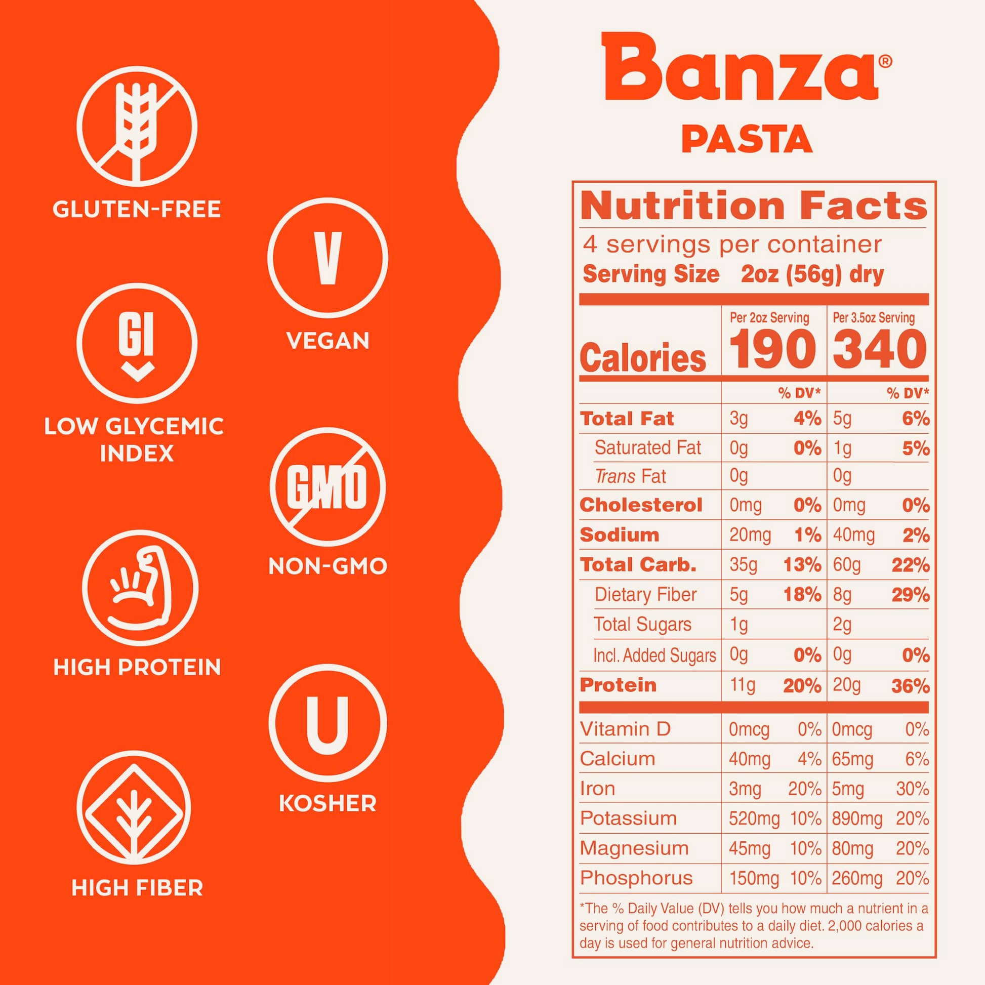 Q: How does Banza Pasta compare to traditional pasta in terms of nutrition?A: Banza Pasta contains 20g of plant-based protein and 8g of fiber per serving, which is significantly higher than leading traditional pasta brands. It also has 25% fewer net carbs, making it a nutritious choice for those watching their carbohydrate intake.