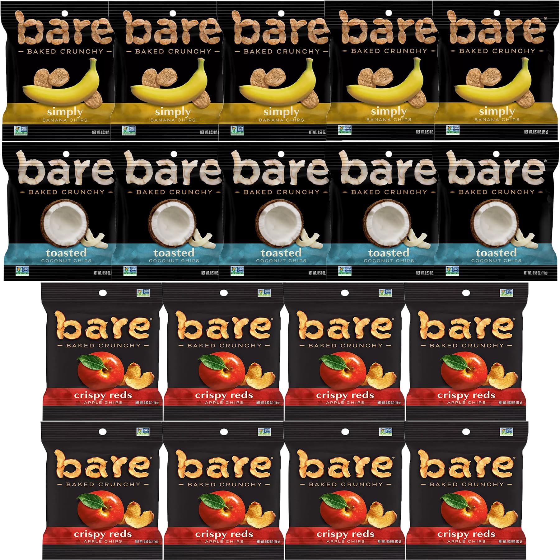 Q: What types of chips are included in the Bare Chips Variety Pack?A: The Bare Chips Variety Pack includes an assortment of 8 Crispy Reds, 5 Simply Banana, and 5 Toasted Coconut chips, providing a delightful mix of flavors.