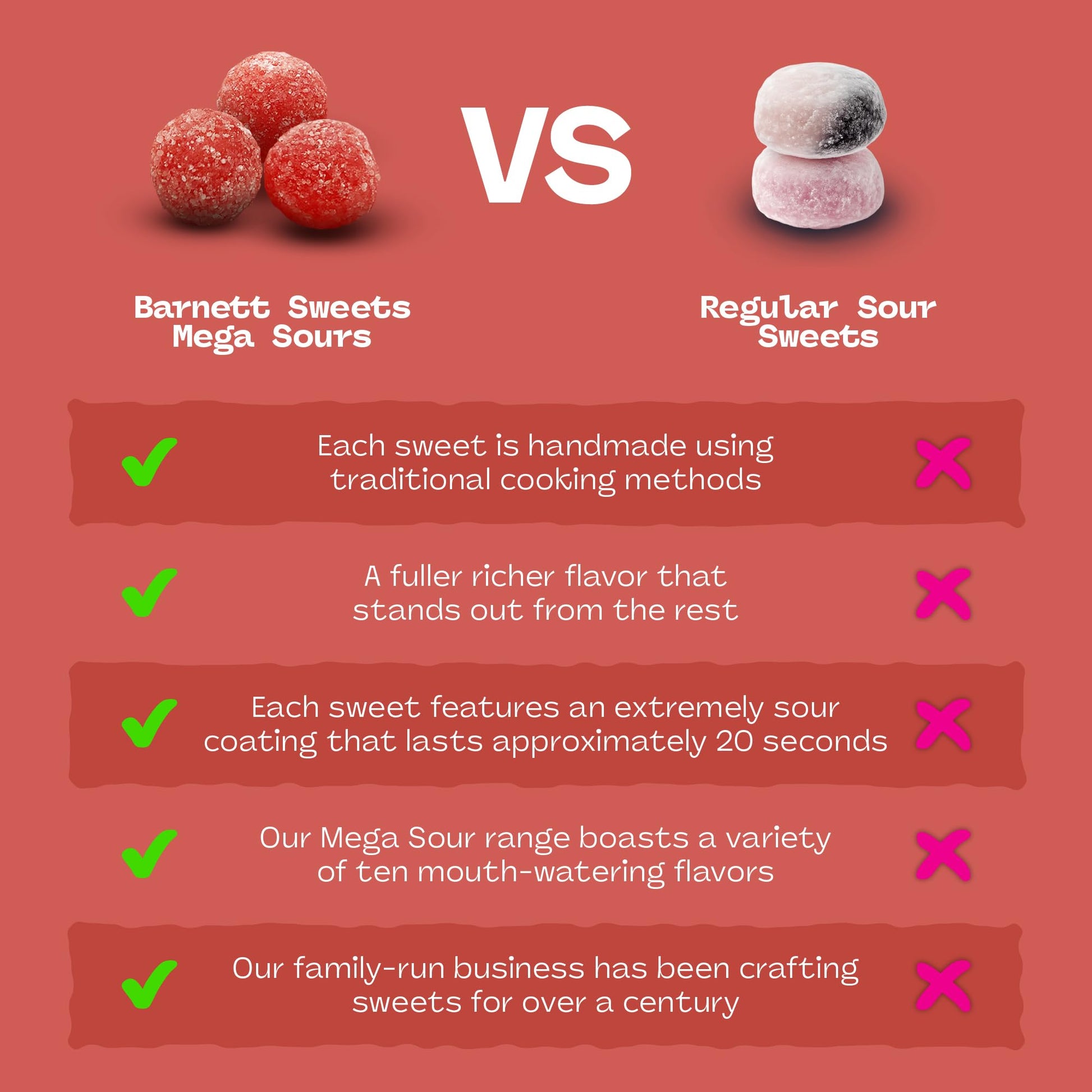 Barnetts Mega Sour Cherry is not just a sweet, it is a full-on flavour challenge for thrill-seekers and candy lovers alike. Handmade in Britain using traditional copper pan methods, each boiled sweet packs an electrifying sour punch before revealing a juicy sweet centre that keeps taste buds coming back for more. Famous on social media and loved across generations, our Mega Sours are rooted in over 125 years of sweet-making heritage, bringing bold flavours and timeless fun to every bite. A must-have for parties, birthdays, gaming nights or simply sharing with friends, these iconic sour candies are a must for anyone brave enough to take on the worlds sourest treat.