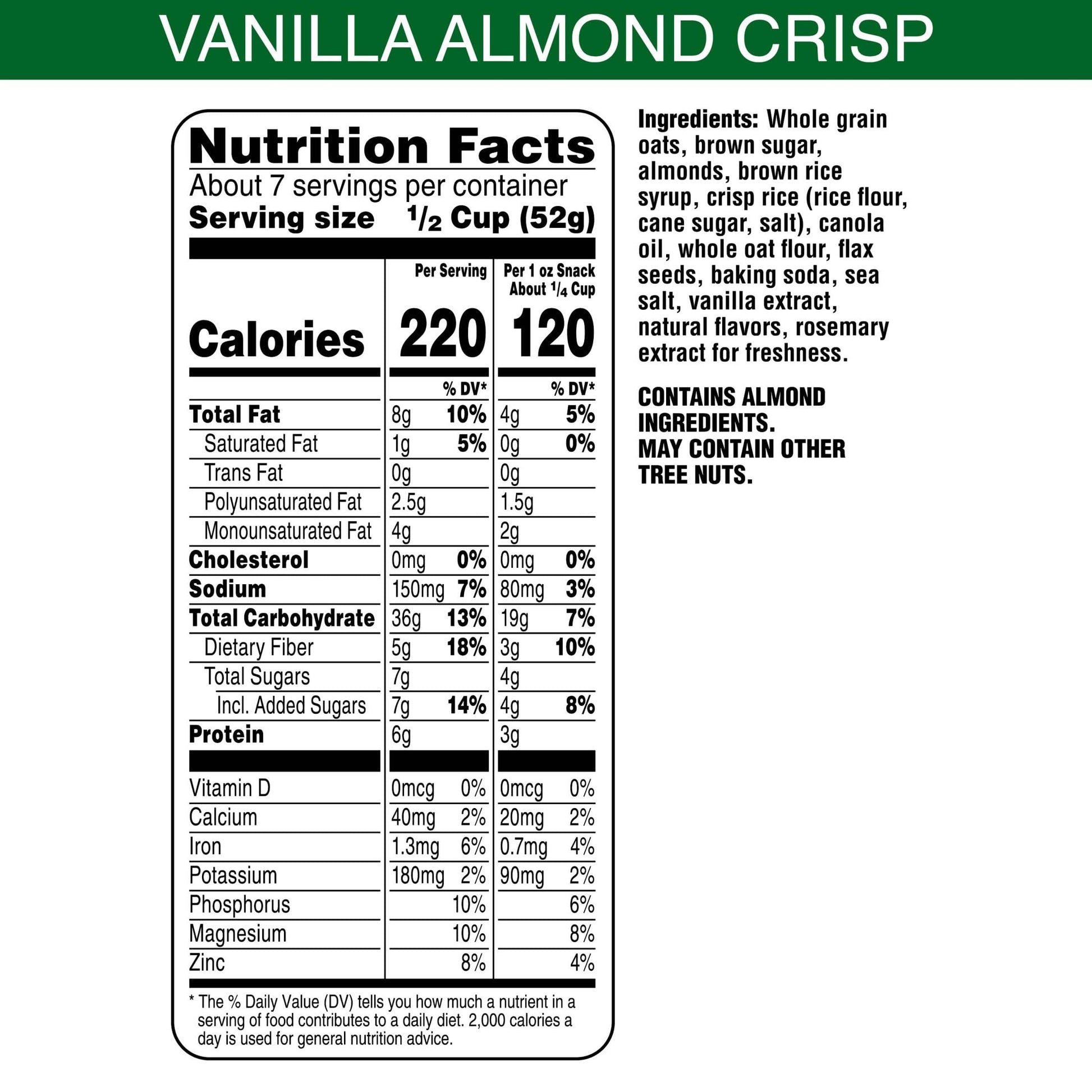 Q: What is the nutritional content of Bear Naked Vanilla Almond Crisp granola?A: Each serving of Bear Naked granola contains 28g of whole grains and 6g of protein, making it a nutritious option for breakfast or a healthy snack.