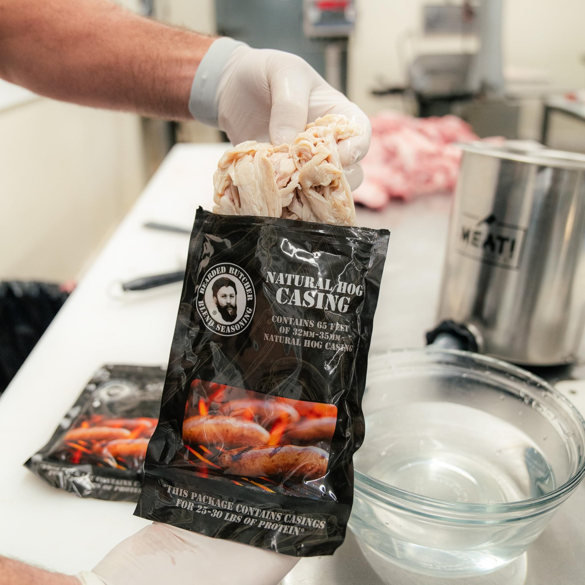 - Q: How much meat can I stuff with one pack of these casings? A: One pack of Bearded Butchers Natural Hog Casings can stuff approximately twenty-five to thirty pounds of meat, providing enough casing to create a variety of sausage types.