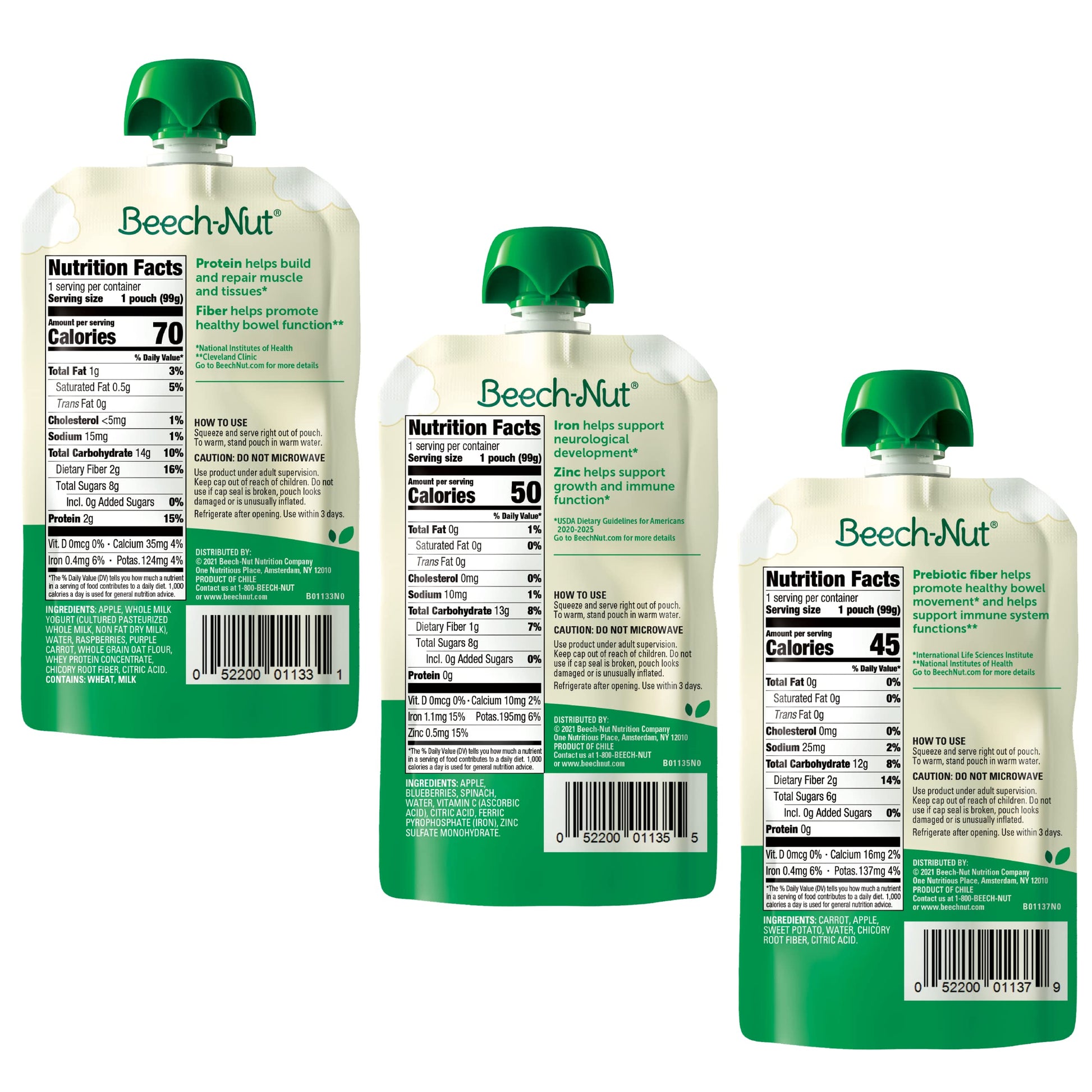 This Beech-Nut Toddler Pouch Variety Pack Includes 3 Delicious Blends To Get The Most Out Of Your Toddler'S Meals. The Variety Pack Contains (6) Protein & Fiber Pouches (With A Puree Of Apple, Yogurt, Raspberries, Purple Carrot & Oat), (6) Iron & Zinc Pouches (With A Puree Of Apples, Blueberries, And Spinach), And (6) Prebiotic Fiber Pouches (With A Puree Of Carrot, Apple & Sweet Potato). These Stage 4 Beech-Nut Pouches Are Ideal For Your 12+ Months Old Toddler.