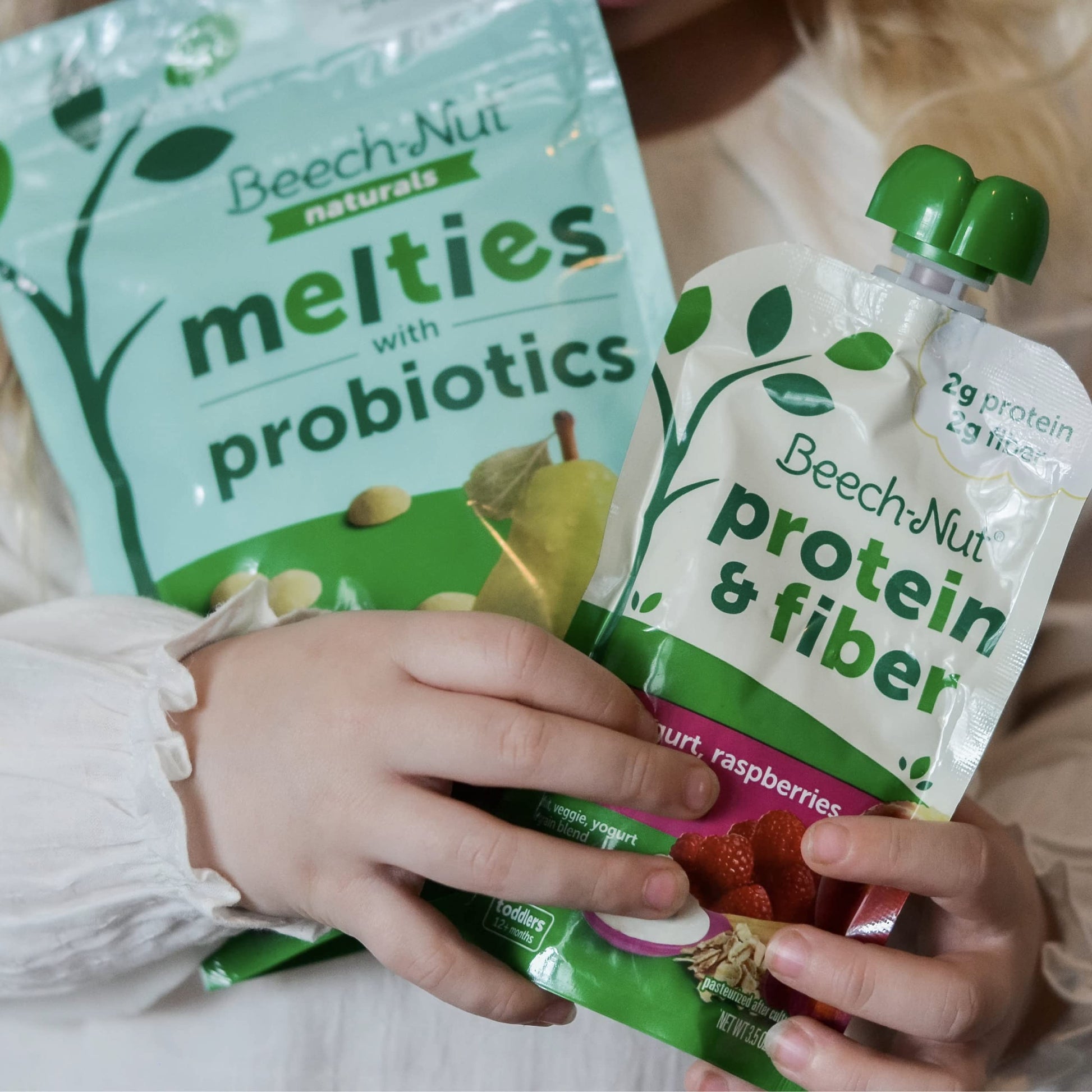 Q: What flavors are included in the Beech-Nut Baby & Toddler Food Pouches Variety Pack?A: The Beech-Nut Toddler Pouch Variety Pack includes three delicious flavors: Protein & Fiber (apple, yogurt, raspberry, purple carrot, oat), Iron & Zinc (apple, blueberry, spinach), and Prebiotic Fiber (carrot, apple, sweet potato).