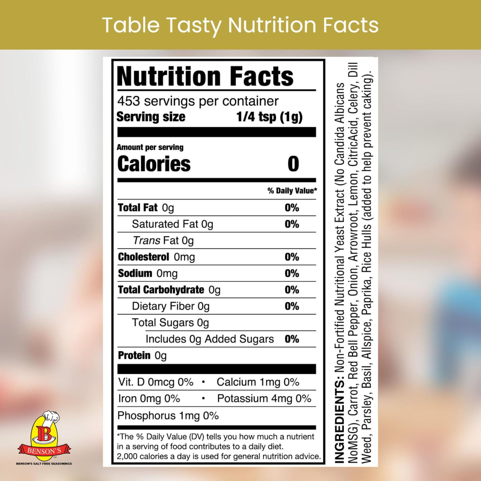- Q: Does Benson’s Table Tasty Salt Substitute contain any preservatives? A: No, Benson’s Table Tasty Salt Substitute is free from preservatives, ensuring you get a clean and natural seasoning option.