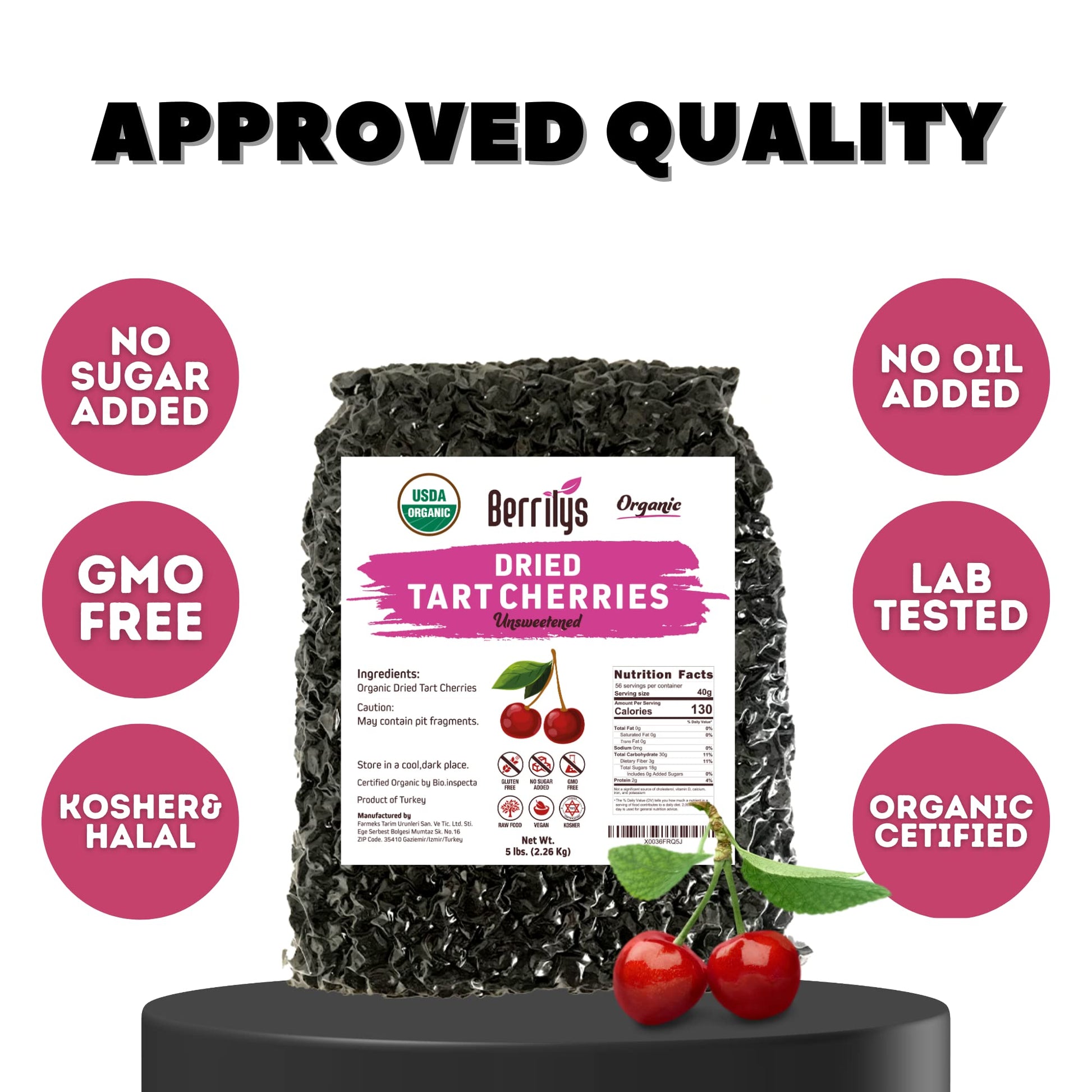 - Q: What makes Berrilys Dried Tart Cherries a healthy snack option? A: Berrilys Dried Tart Cherries are a healthy snack choice because they are unsweetened and contain no added sugars. They are rich in antioxidants and offer essential nutrients that support overall health, making them a nutritious addition to your diet.
