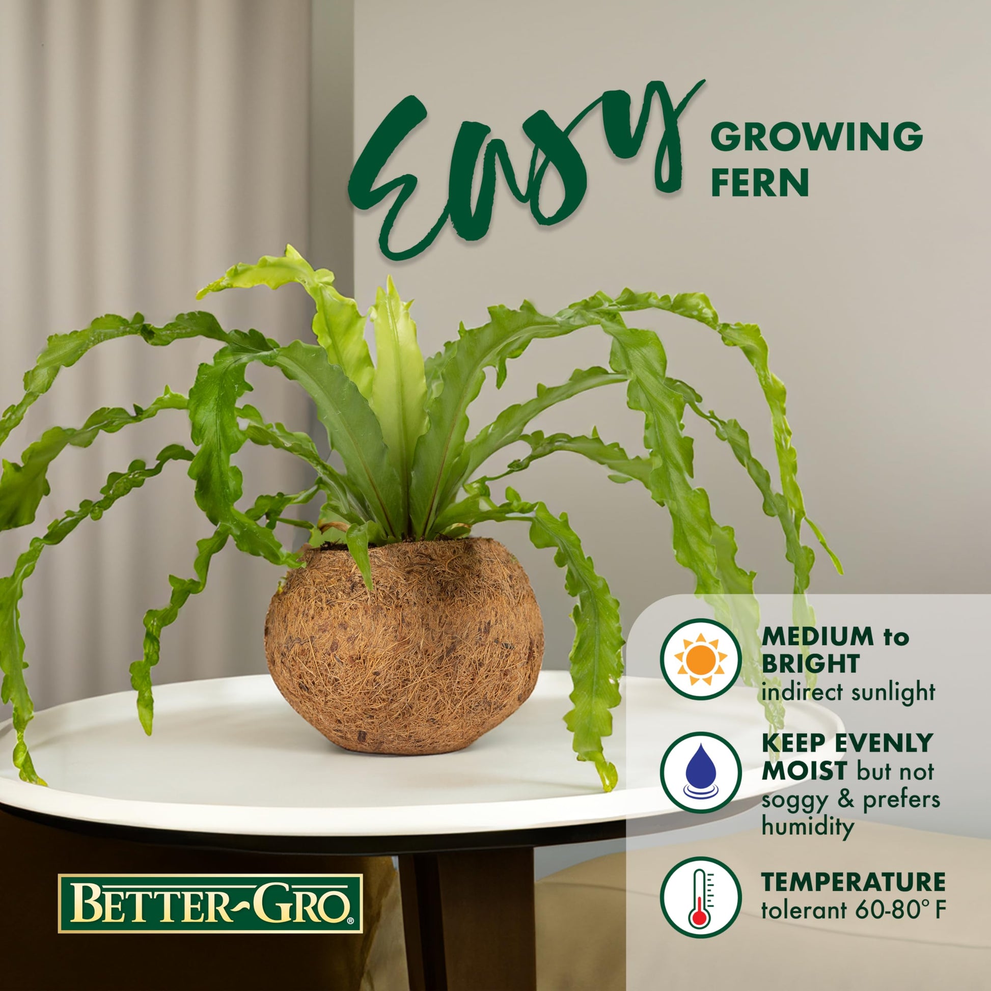Q: What type of care does the Birds Nest fern in the Hanging Kokodama require?A: The Birds Nest fern thrives in indirect light or partial shade and prefers consistently moist soil. It's important to allow the top inch of soil to dry out between waterings. Regular misting or using a humidifier will help maintain the high humidity that ferns need.