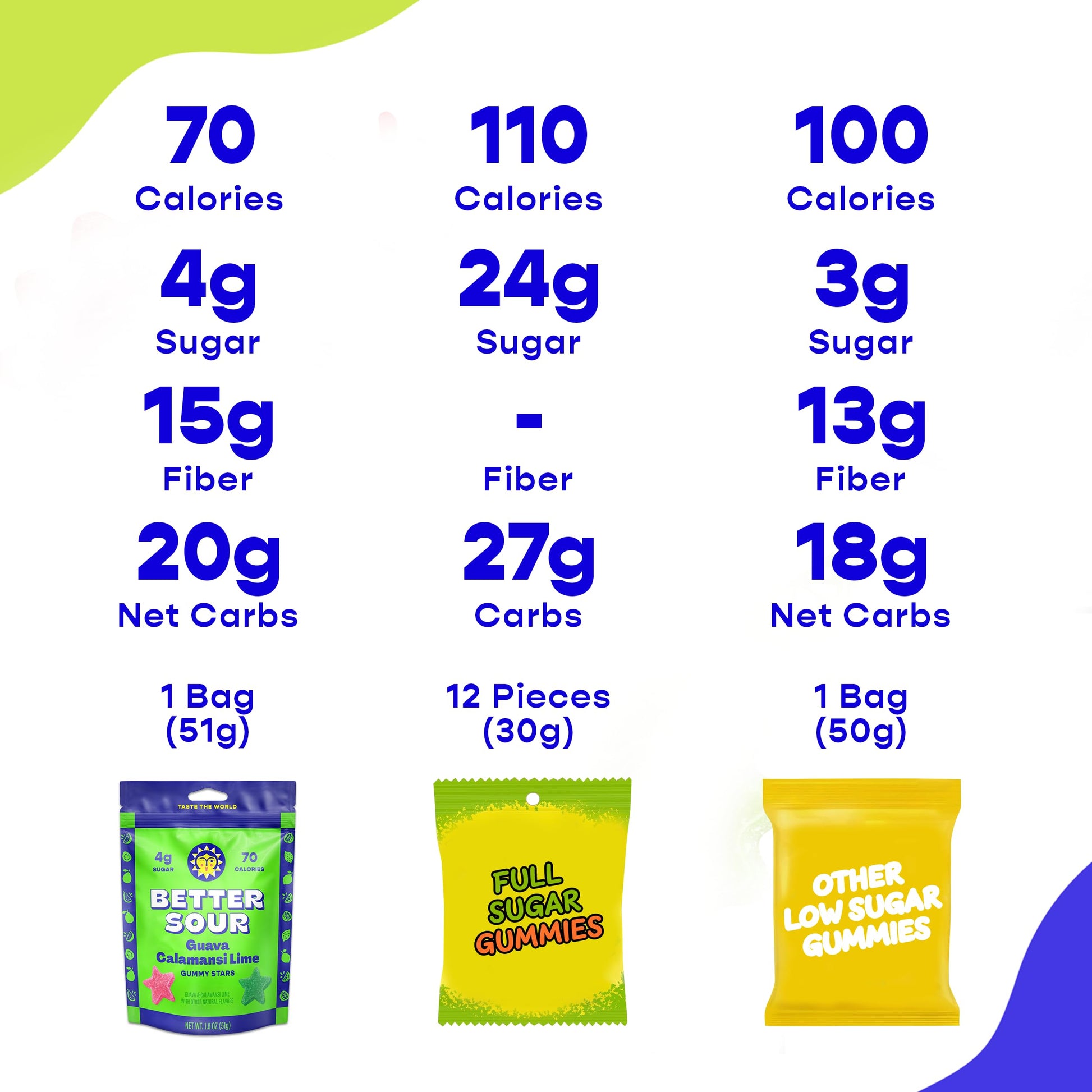 Q: Is there any added sugar in Better Sour Guava Calamnsi Lime Gummy Stars Candy?A: No, these gummies contain zero added sugar, allowing you to enjoy a sweet treat without the extra calories.
