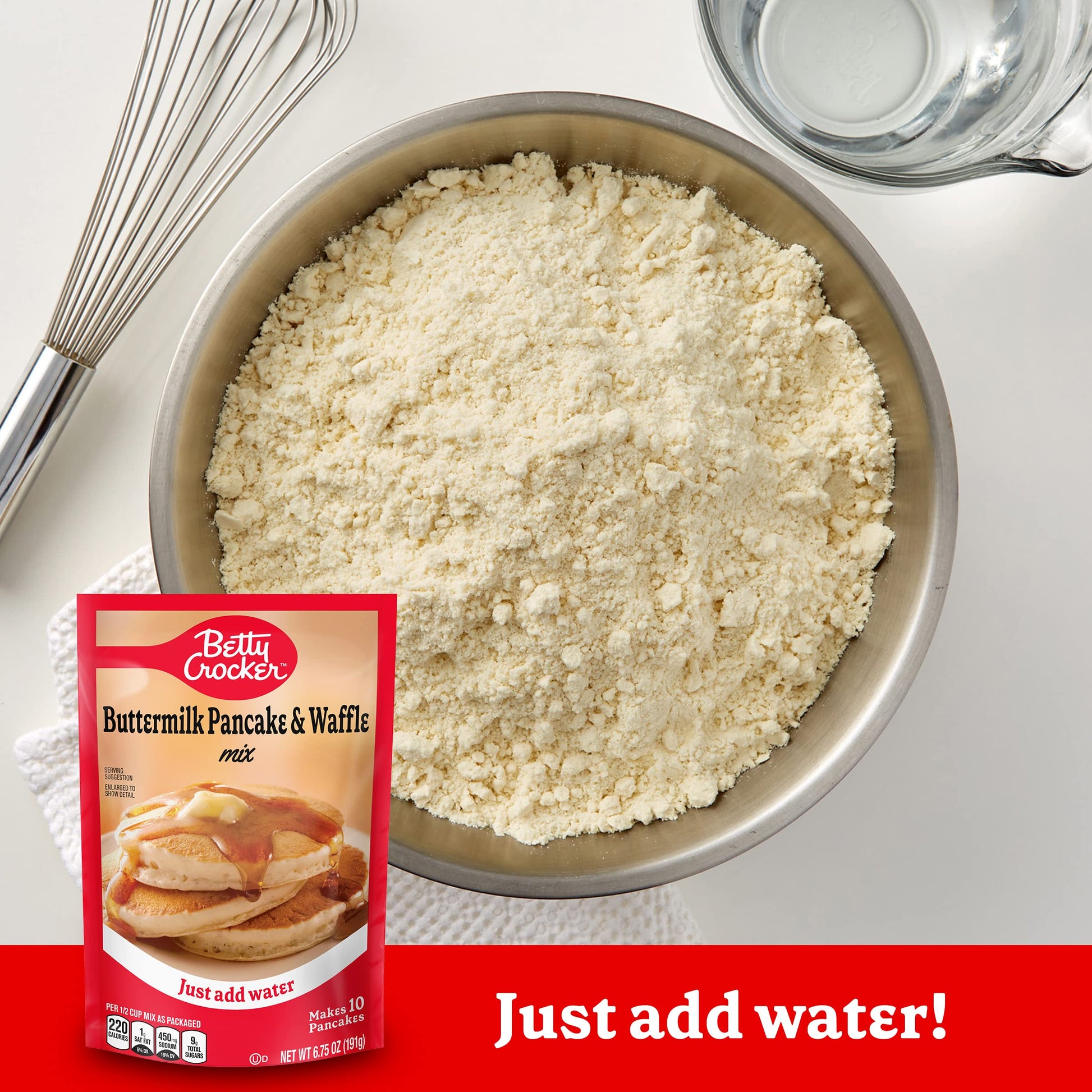 Betty Crocker Buttermilk Pancake and Waffle Mix is the easiest way to make a delicious breakfast favorite. Use as pancake mix, waffle mix and more! In a few simple steps, your family will be chowing down on fluffy, warm goodness. Serve with syrup, fresh fruit, chocolate chips or whipped cream for sweet or fruity flavors. When you're craving something delicious and easy as part of your breakfast, check out this versatile baking mix. For more than a century, Betty Crocker has been a popular creator of easy, delicious recipes. Today, the Betty Crocker kitchen is still providing convenient, tasty dessert mixes, frostings, and convenient meal options and side dishes. And today, you can still find those same products you grew up with on grocery shelves.