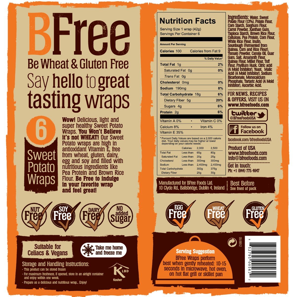 Our Sweet Potato Wraps Are The Latest Edition To Our Bfree Wrap Family. Sweet Potatoes Are One Of The Most Popular And On Trend Vegetables At The Moment, So Given Their Nutritional Benefits, They Were A Perfect Match For Bfree. Our Bfree Sweet Potato Wraps Are Made With Real Sweet Potatoes Ground Down In To A Flour. With Only 95 Calories, High In Fiber, No Added Sugars, Our Sweet Potato Wraps Are Free From The Top 14 Allergens Along With Being High In Antioxidant Vitamin E. Free From Wheat, Gluten, Egg, And Soy And Filled With Nutrious Ingredients Like Pea Protein And Brown Rice Flour.Perfect For Lunch On The Go Or As A Tasty Pizza Base, These Wraps Are So Versatile And So Tasty You Wont Believe Theyre Not Wheat!