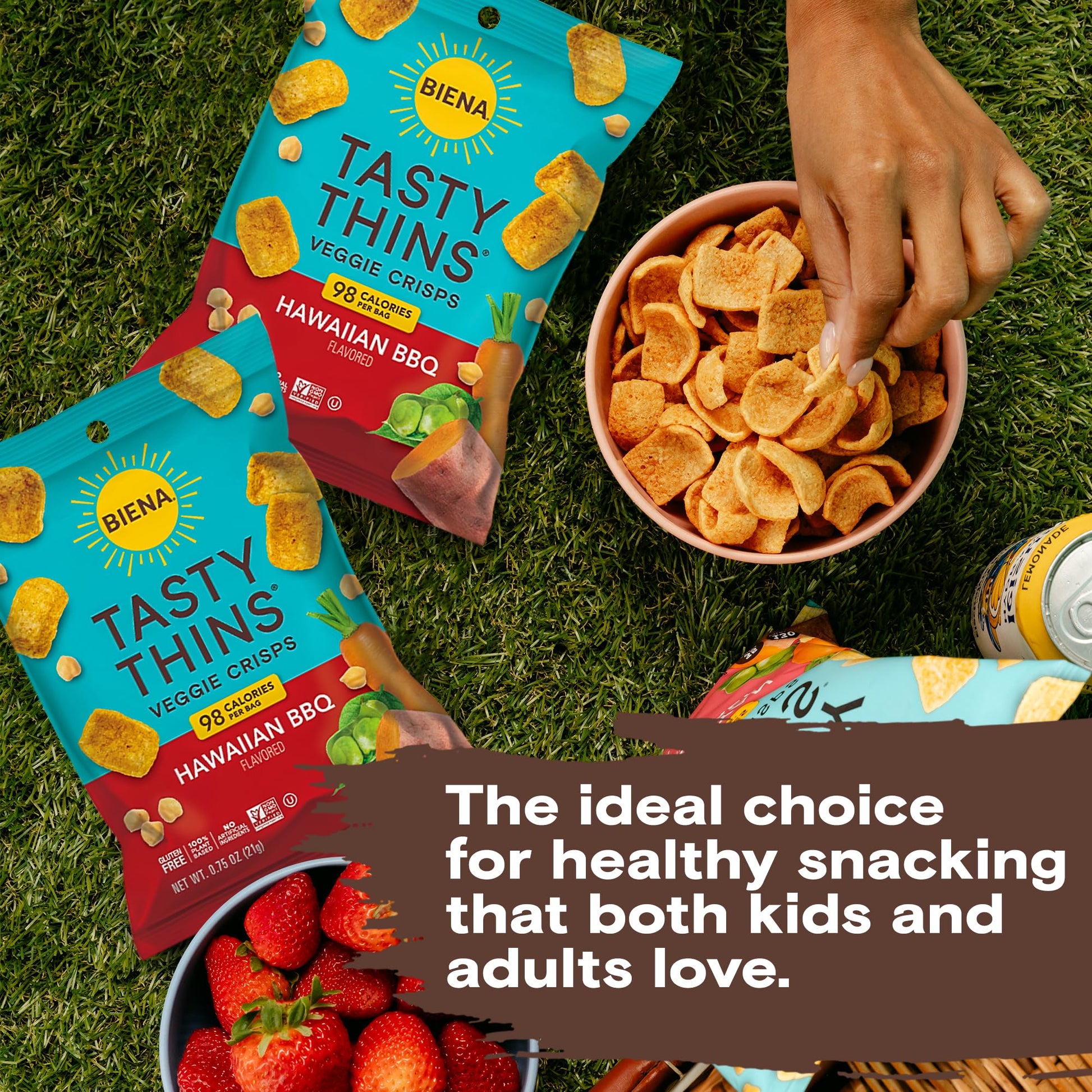 Q: Can I use BIENA Tasty Thins Veggie Crisps for dipping?A: Absolutely! BIENA Tasty Thins Veggie Crisps are perfect for dipping due to their crunchy texture and delicious Hawaiian BBQ flavor, enhancing your snacking experience.