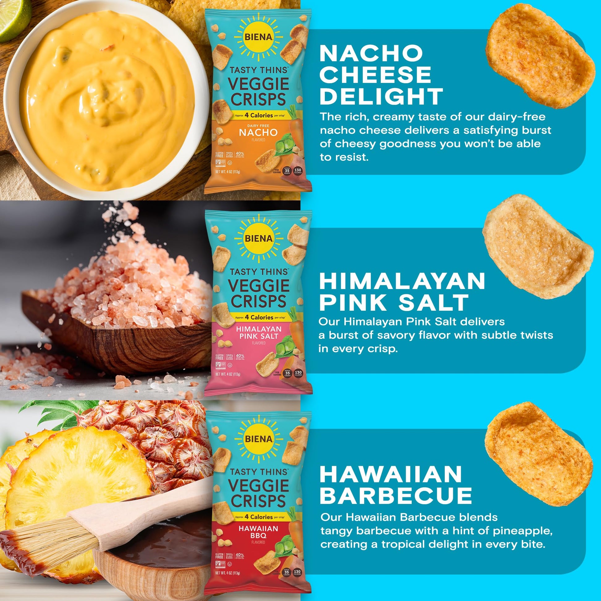 Introducing Biena Tasty Thins Veggie Crisps, A Guilt-Free Snack Made With Chickpeas, Carrots, Sweet Potatoes, And Peas. Seasoned With Hawaiian Barbecue, Himalayan Pink Salt, And Dairy-Free Nacho Cheese Flavor, These Crispy Chips Are Perfect For Dipping And Munching. With Just 4 Calories Per Crisp, They'Re A Low-Calorie, Healthy Choice Made With Real Vegetables. Gluten-Free, Non-Gmo, And Proudly Made In The Usa, Enjoy These Allergy-Friendly Veggie Crisps As A Nutritious Addition To Your Snacking Routine.
