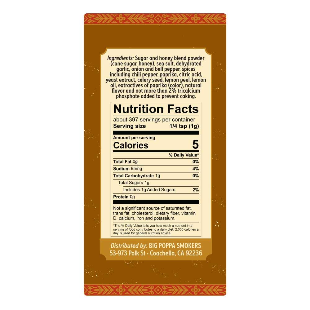- Q: What are the main ingredients in Big Poppa’s Sweet Money BBQ Rub? A: Big Poppa’s Sweet Money BBQ Rub is made from a blend of granulated honey, sea salt, garlic powder, onion powder, and paprika, ensuring a sweet and savory flavor profile.