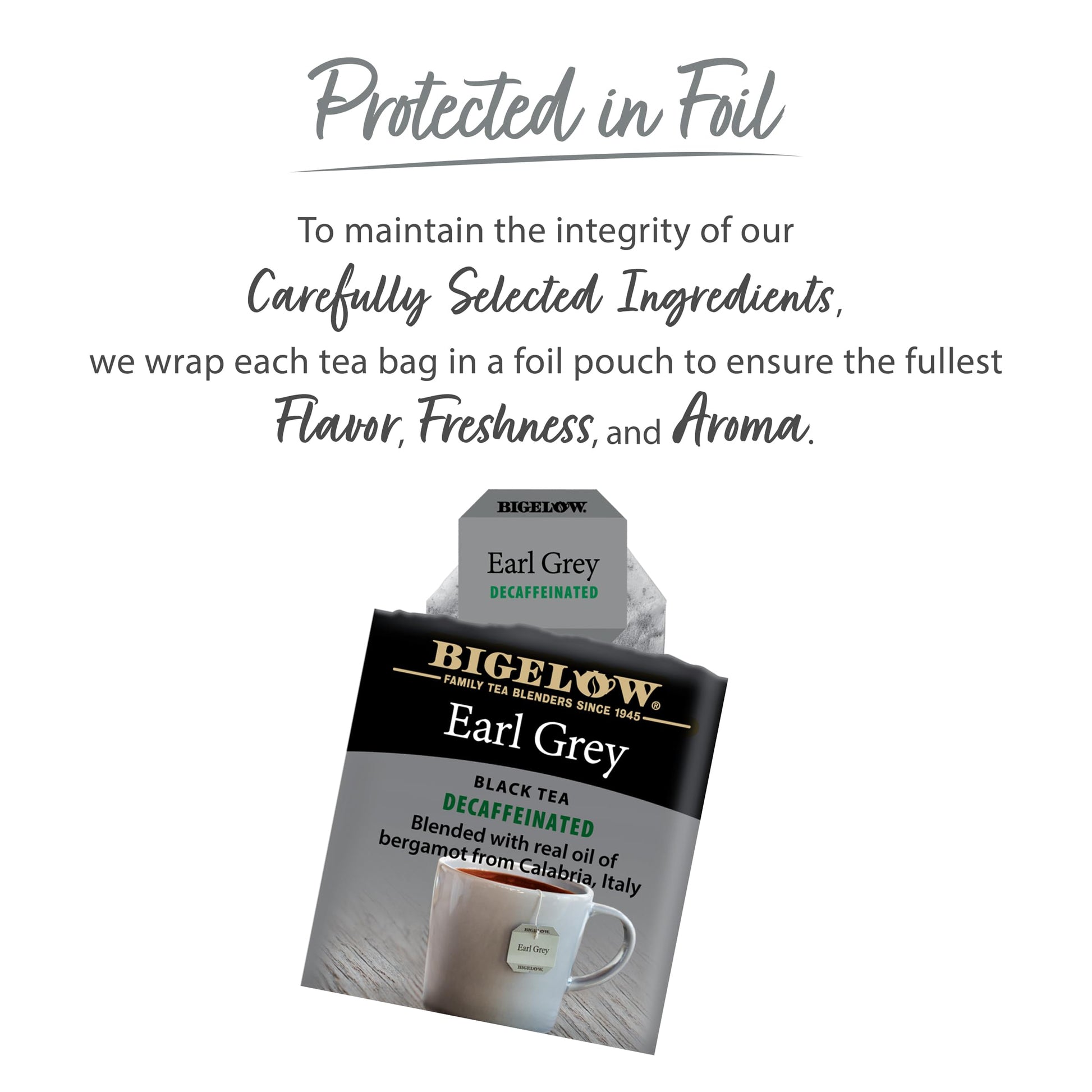• Q: Are the tea bags in the Bigelow Earl Grey pack individually wrapped? A: Yes, each tea bag in the Bigelow Decaffeinated Earl Grey Black Tea pack is individually wrapped in foil pouches to ensure peak flavor, freshness, and aroma, making it convenient to enjoy your tea anywhere.