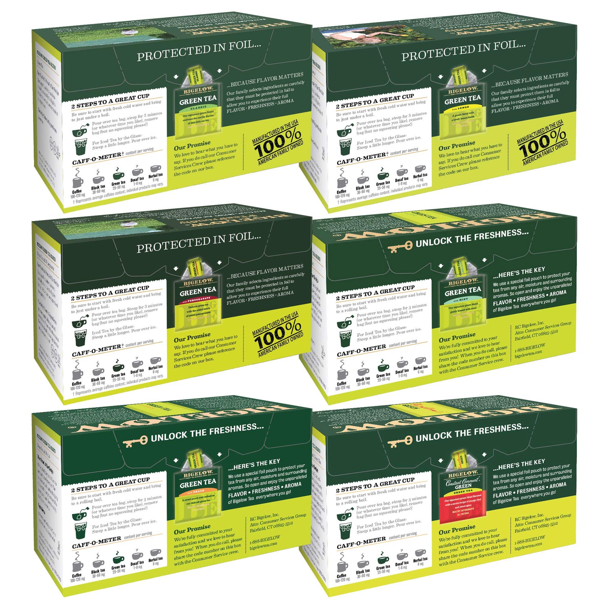 Product DescriptionOur Green Tea Sampler with 120 individually-wrapped tea bags offers many wayss to indulge your love of Green Tea.About the BrandThe Bigelow Tea Story Beginning the moment our founder, Ruth Campbell Bigelow created "Constant Comment" Tea in her kitchen in 1945, our family has focused on just one thing trying to make the finest teas possible. Over the years we have introduced many new flavors as well as concepts in tea. Today we offer a selection of deliciously different blends of teas and green teas, a wide variety of herbal teas and teas flavored with real fruit juice. Today Bigelow Tea is the number one specialty tea company in the United States. And to think it all began with the first legendary black tea flavored with golden orange rind and sweet spice "Constant Comment"Tea. Bigelow takes immense pride in providing the tea drinking community with the best tea at a great value. We only use hand- picked teas, real spices, flavors and herbs. The flavors and blends we have created are second to none. Some of our teas contain up to twenty different ingredients! And because tea is a leaf that can dry out we take steps to protect it. To keep the teas fresh, we seal our tea bags in protective packets. We simply have to protect those delightful flavors. That's why a cup of Bigelow Tea is aromatic and delicious; a true indulgence for the senses.