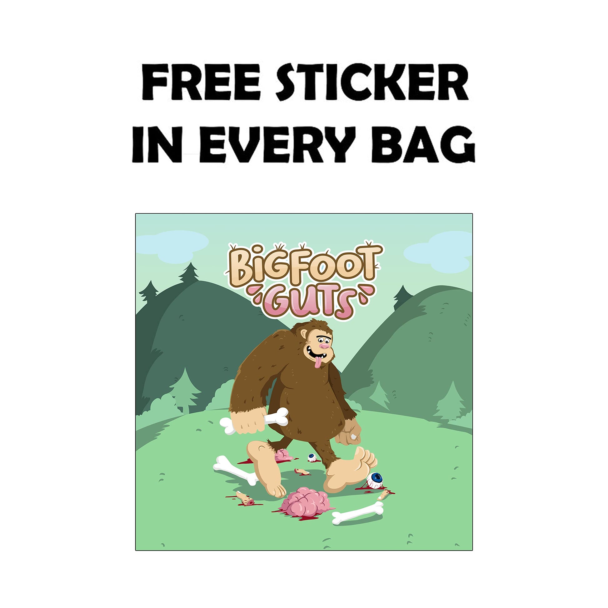 Q: What is included in each bag of BigFoot Guts?A: Each bag of BigFoot Guts contains 5.5 ounces of delicious gummy candy, along with a Bigfoot tattoo and a sticker. This adds extra fun and collectible items for both kids and adults.