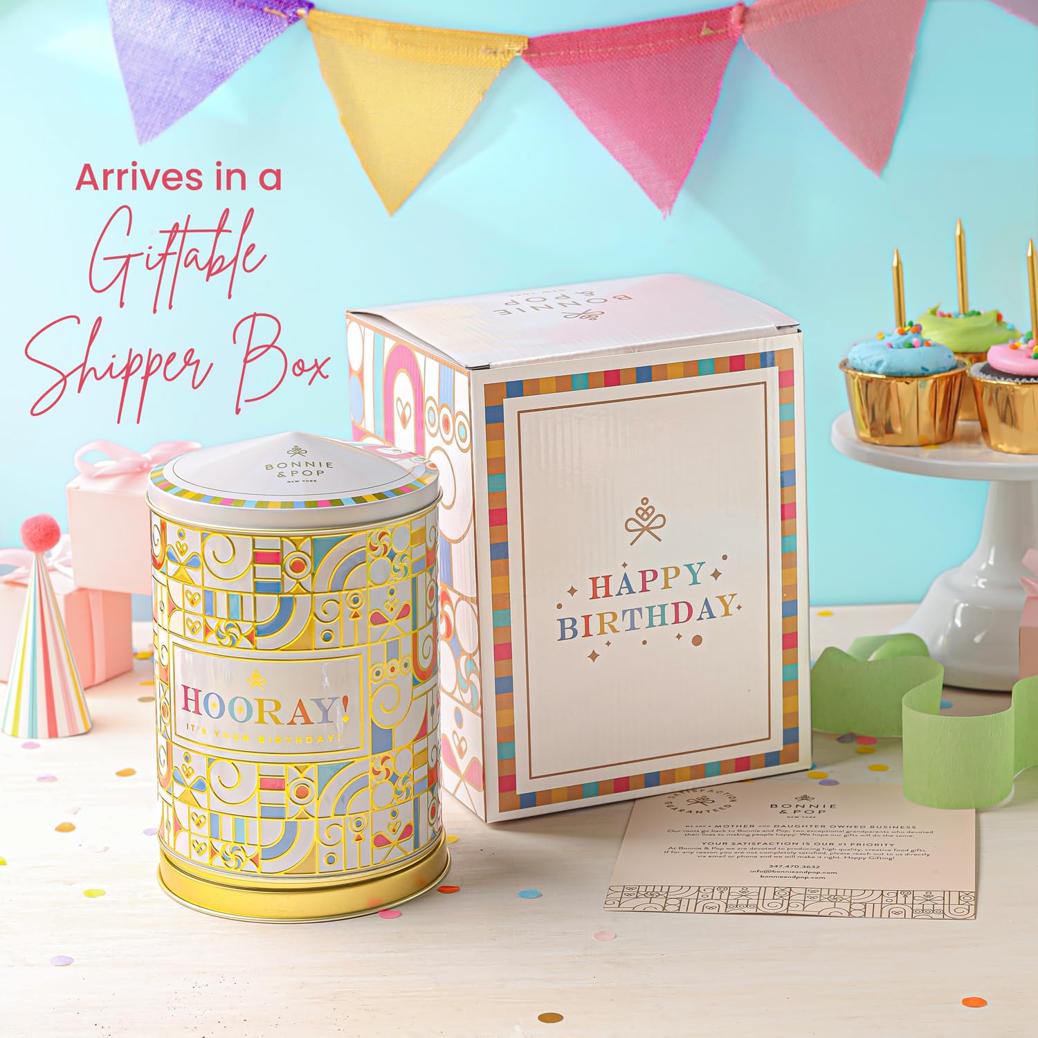 Birthday Gift Basket | Popcorn, Sweets, Candy, Cake Flavors | Tin Spins, Plays Music Happy Birthday | Bonnie and Pop