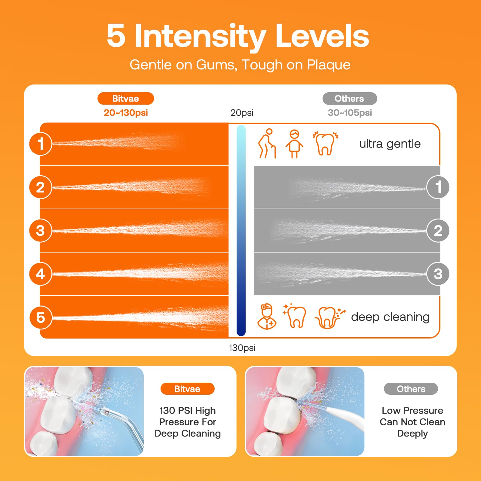 1Bitvae water flosser uses advanced water pressure and pulsation technology to effectively remove plaque and food debris from even the most hard-to-reach areas 2 Wide mouth reservoir easy to clean 3Bitvae water flosser comes whith 260ML Large capacity Water Reservoir -provides extended use without the need for constant refilling 4Advanced 40-Day Battery Life 5With 3 pressure settings and 6 interchangeable tips, our water flosser is good for anyone with a variety of oral care needs 6cordless and portable design water picks makes it easy to use at home or on-the-go 8Whether you suffer from gum disease or simply want to improve your overall oral hygiene, our Water Flosser is the good choice for achieving a cleaner, fresher, and healthier smile