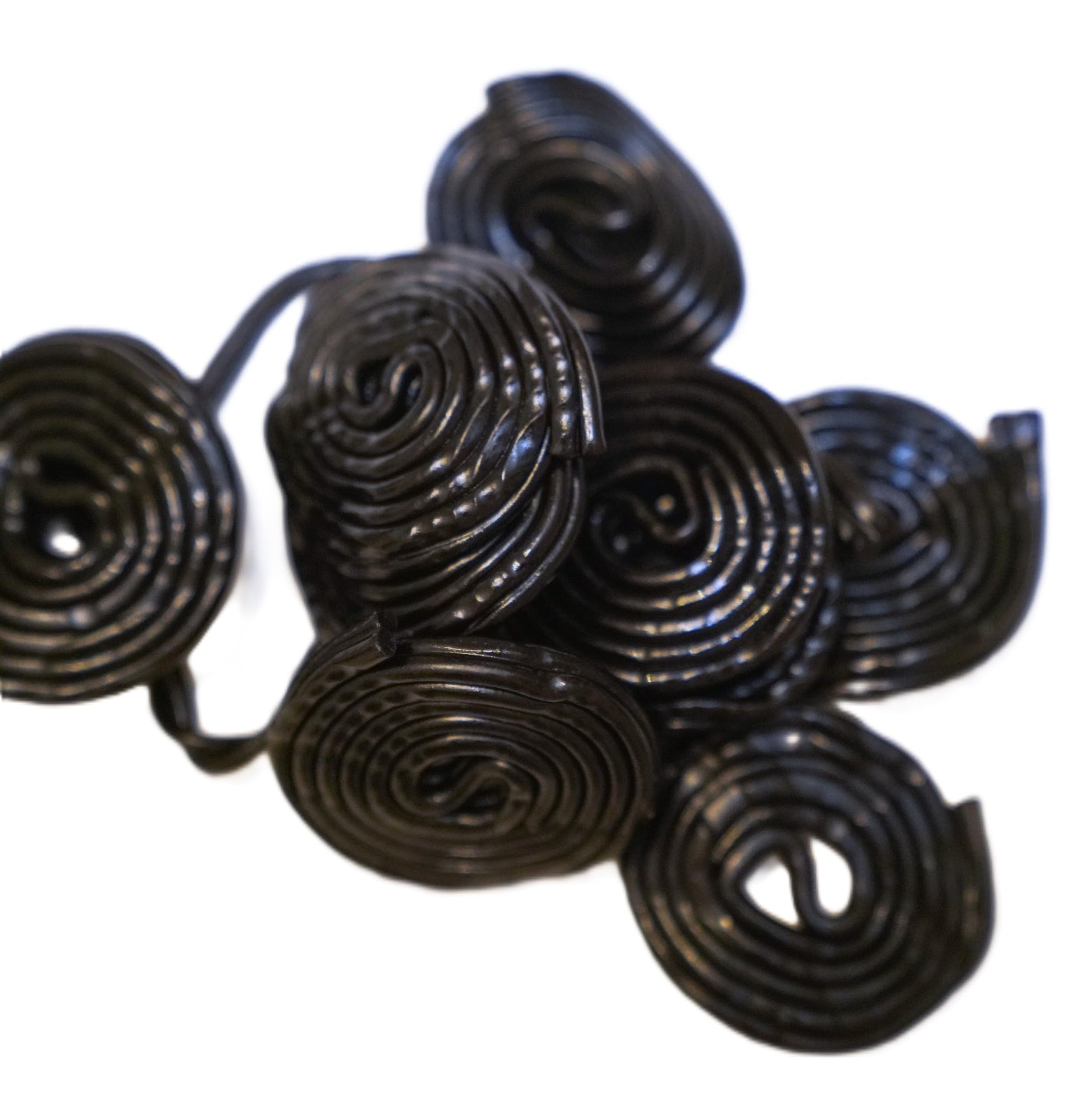 Q: What are Black Licorice Wheels made of?A: Black Licorice Wheels are made from high-quality licorice extract, sugar, and various flavorings to create a deliciously sweet and chewy treat.