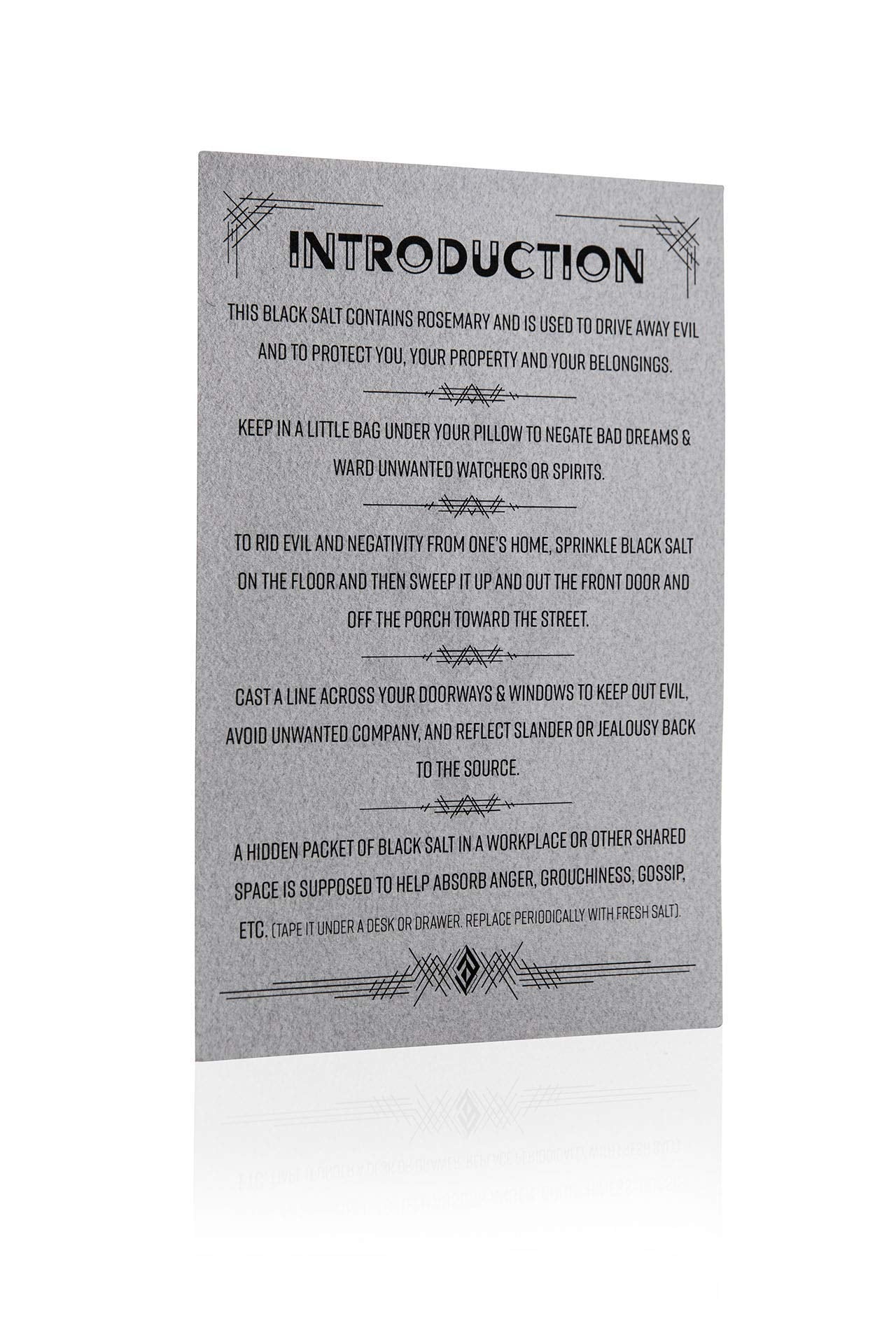 Q: What are the main features of this Black Salt?A: This Black Salt features natural rosemary for protection, includes an instructions card for guidance, is beautifully packed in a velvet bag, and is sold in a 90-gram size.