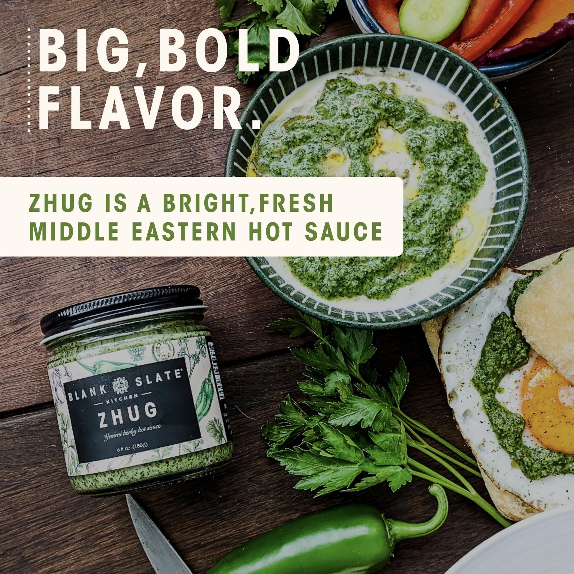 Q: How spicy is Blank Slate Kitchen Zhug?A: Blank Slate Kitchen Zhug has a medium heat level from the jalapenos, balanced with fresh herbs and tangy lemon juice, providing a flavorful kick without overwhelming heat.
