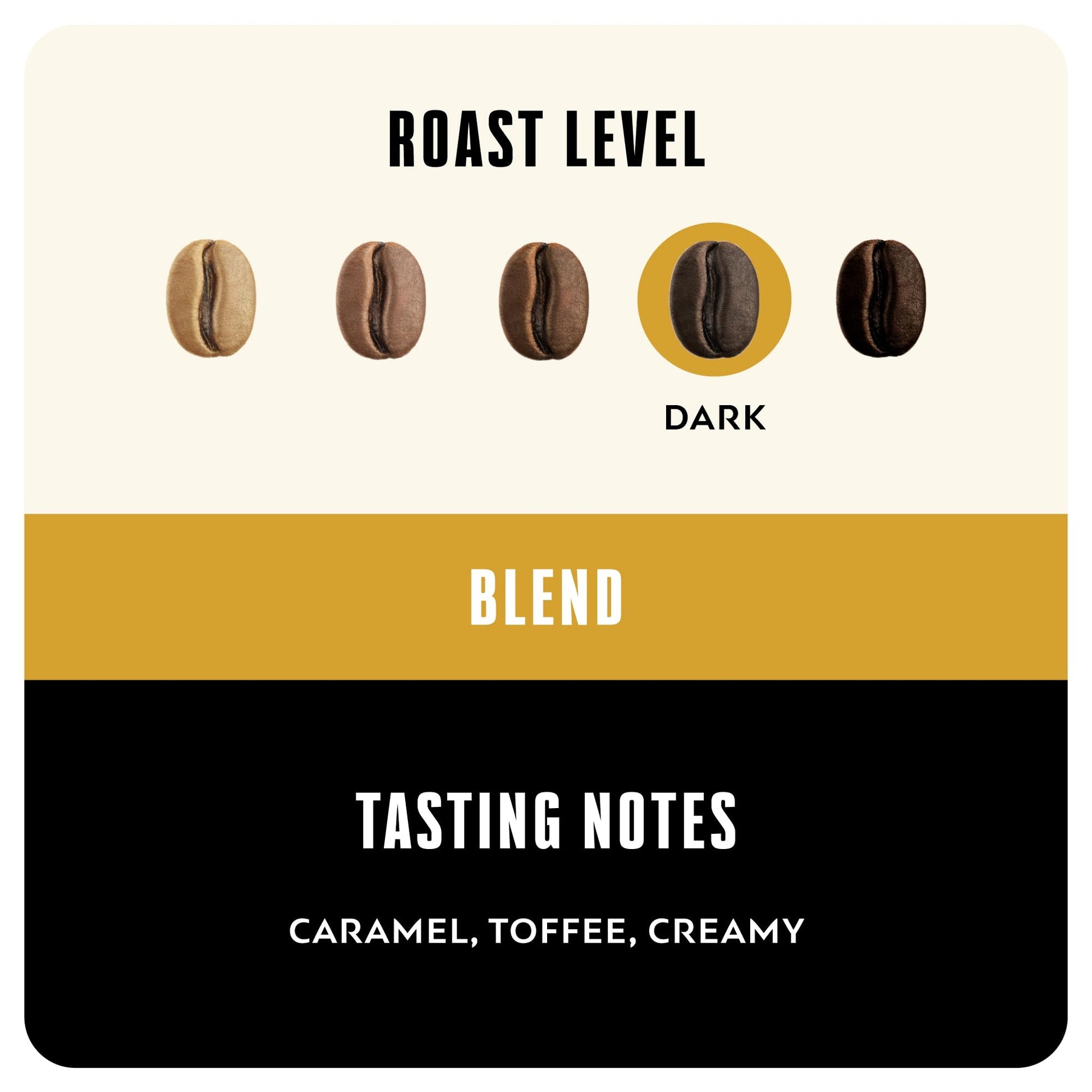 Q: What flavor profile can I expect from this coffee?A: This coffee features a creamy dark roast blend with flavor notes of caramel and toffee, providing a smooth and full-bodied coffee experience that many coffee lovers appreciate.