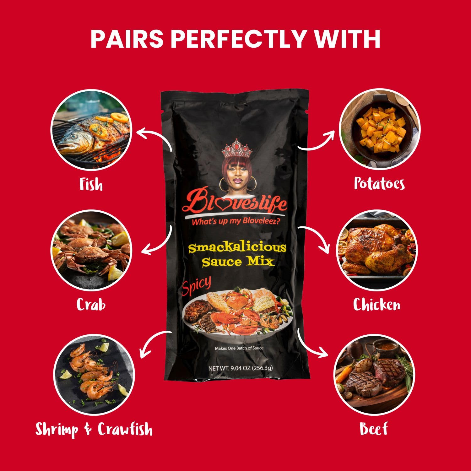 - Q: How do I adjust the spice level when using this seasoning mix? A: You can easily adjust the spice level by choosing the specific variant of Blove's Smackalicious Sauce Seasoning Mix. For a very mild flavor, opt for the Garlic Butter version; for mild, choose the Mild variant; and for a spicy kick, go with the Spicy seasoning mix.