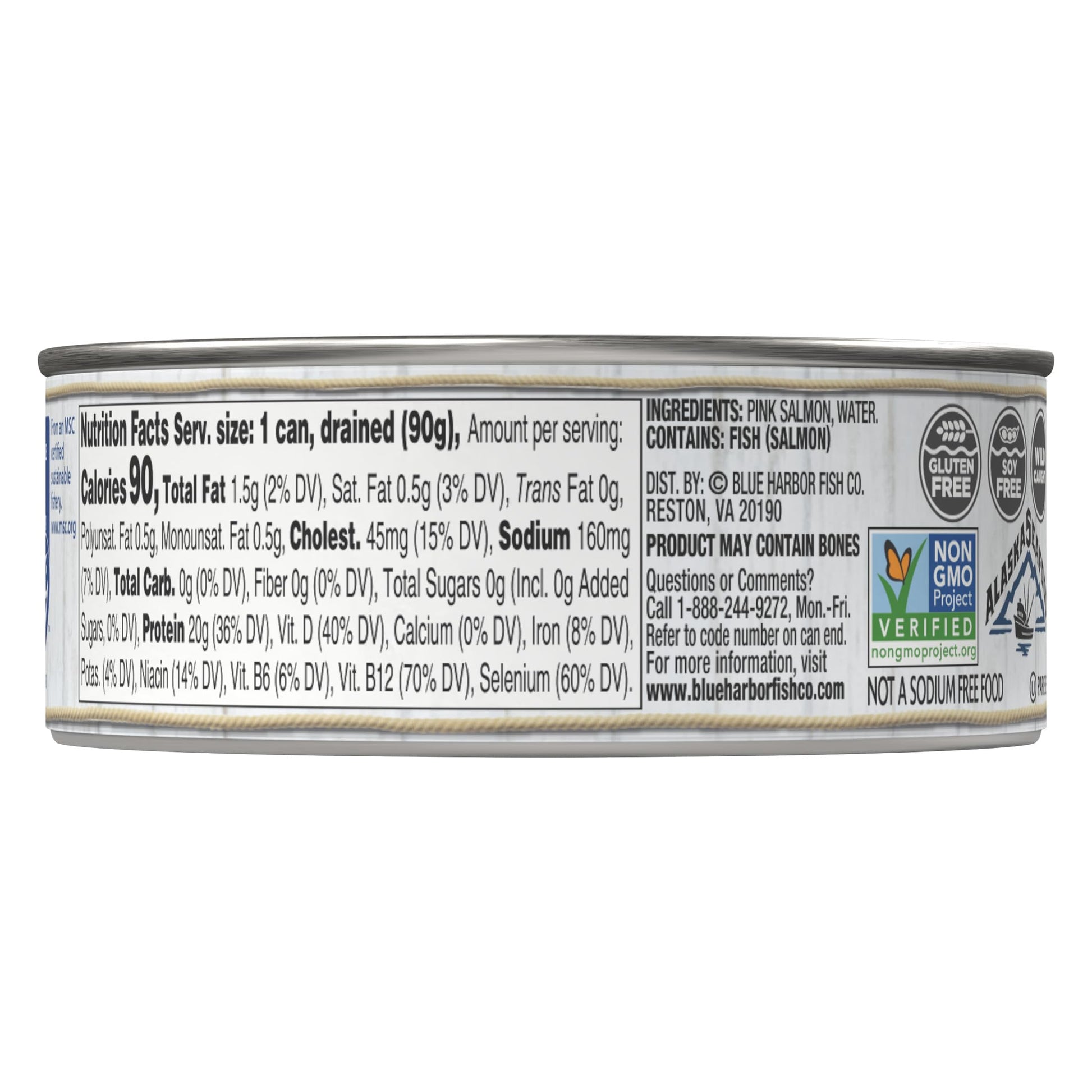 The Untamed Beauty Of Alaska, With Its Snow-Capped Mountains And Shimmering Cold Waters, Brings Forth Some Of Natures Greatest Bounty. Blue Harbor Fish Co. Wild Pink Salmon No Salt Added Is Wild Caught In Alaska. All We Add Is A Little Water. It Is Caught Sustainably And Responsibly; Just Look For The Msc Ecolabel. Featuring Hand-Packed, Skinless, Boneless Pink Salmon, Youll Be Enjoying Fish Just The Way Nature Intended. The Delicious, Mild, Clean Flavor Is Perfect When Eaten Right Out Of The Can Or Incorporated Into Your Favorite Recipe. You Can Taste The Care That Goes Into Every Can. Plus, With This 12-Pack, You Can Always Keep The Perfect Seafood Lunch, Snack Or Dinner Within Reach Blue Harbor Fish Co. Wild Pink Salmon In Water No Salt Added Is Soy Free And Gluten Free. It Is Also Msc Certified Sustainable.