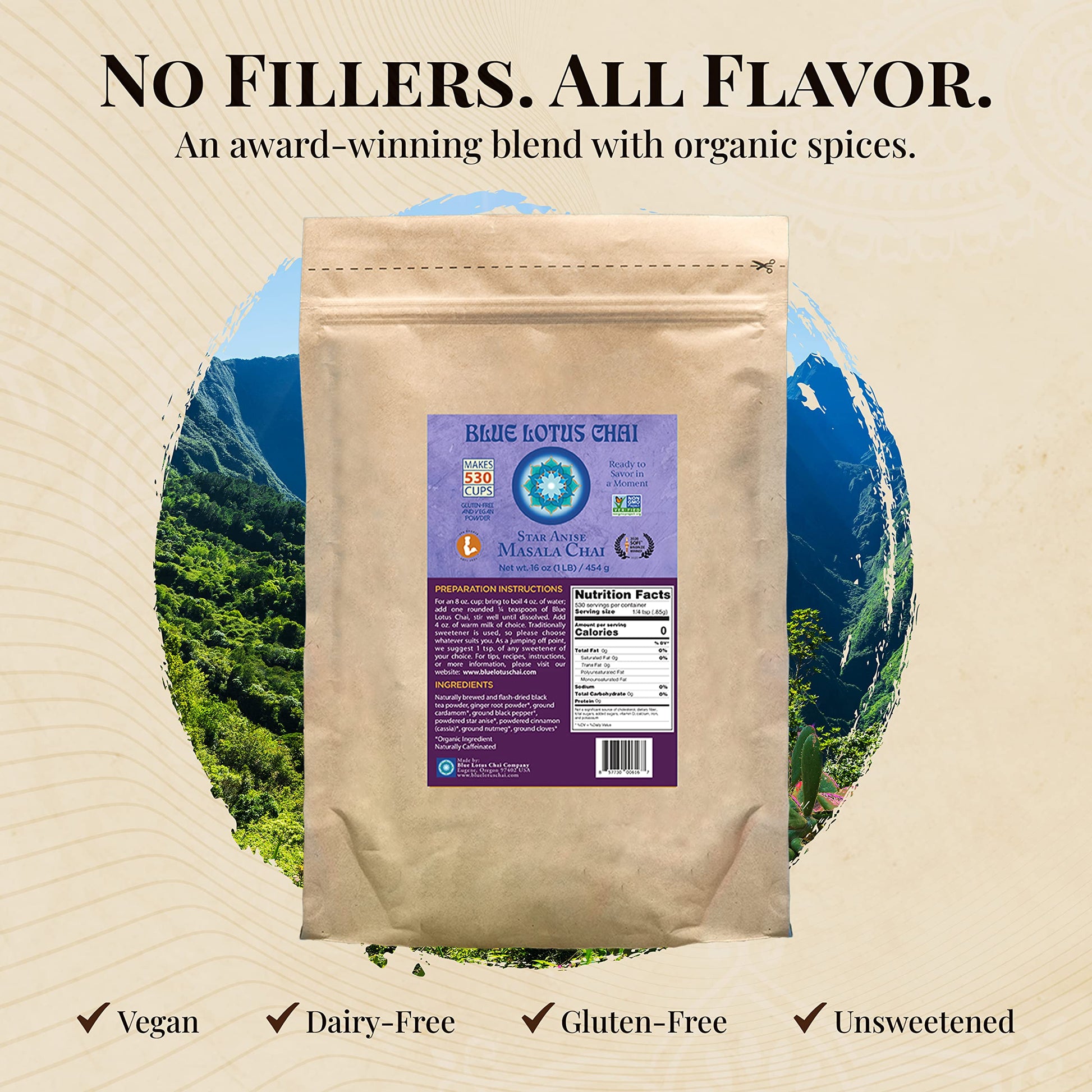 Q: What makes Blue Lotus Chai different from other chai powders?A: Blue Lotus Chai stands out due to its use of 100% certified organic spices and no additives. Unlike other brands, it contains no milk powders or sweeteners, allowing for a pure and customizable chai experience.