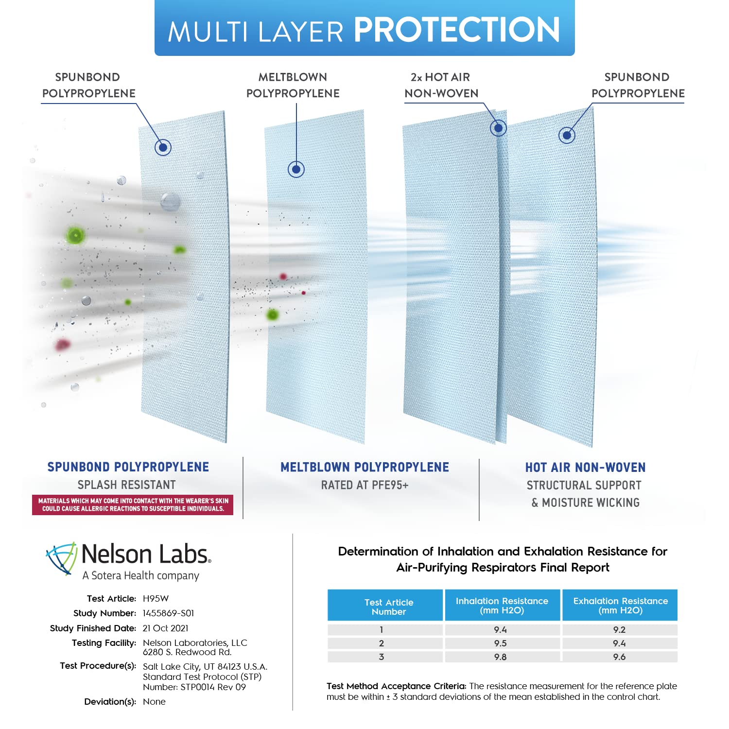 Q: How does the 5-layer filtration technology enhance comfort and protection?A: The 5-layer filtration technology includes an ultra-high grade electrostatically charged meltblown polypropylene filter, which offers maximum protection while being over 50% more breathable than the NIOSH minimum requirements.
