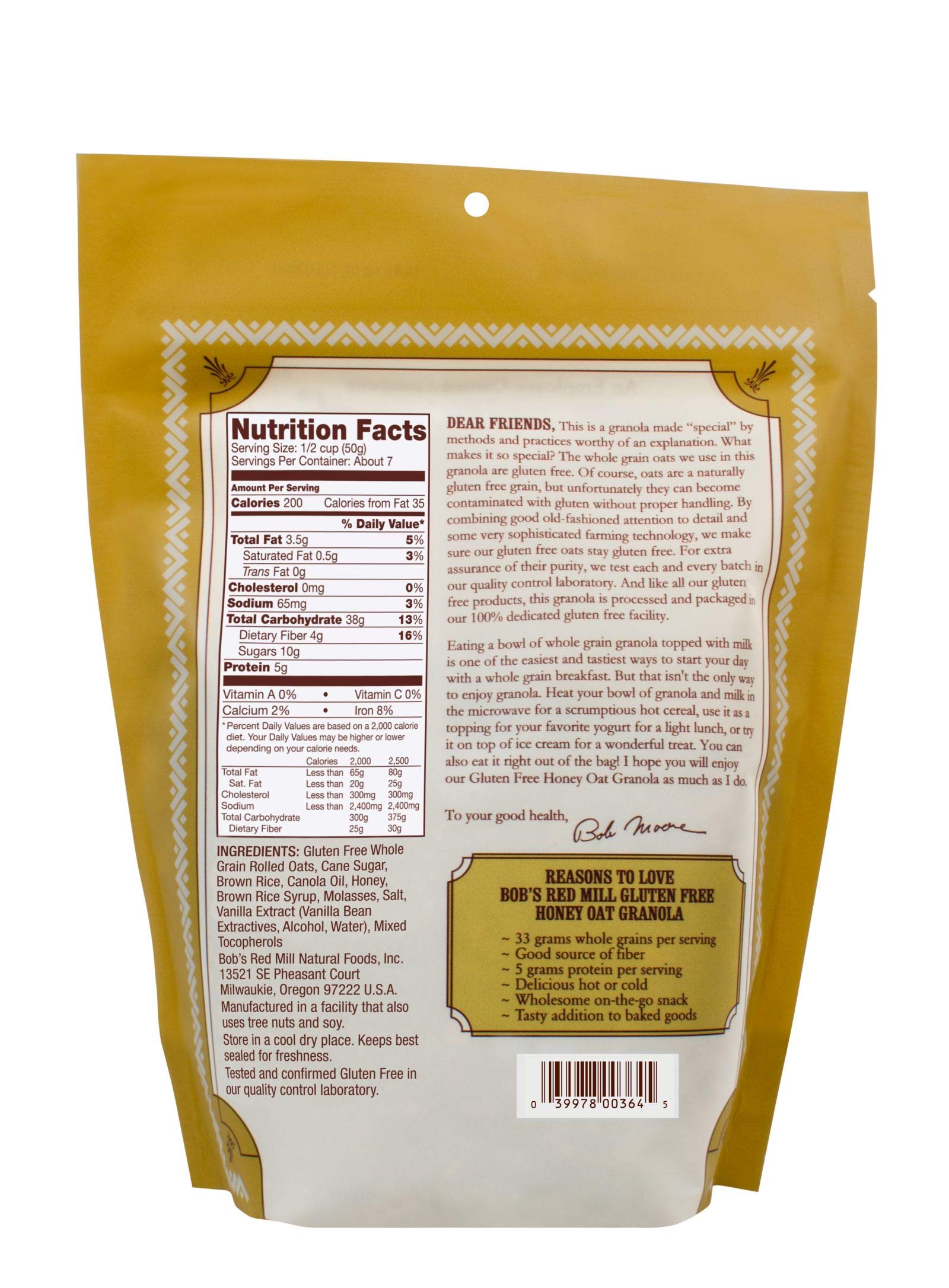 Bob'S Red Mill Gluten Free Honey Oat Granola Is A High-Fiber Whole Grain Cereal Made With Gluten Free Old-Fashioned Oats. Eat It With Milk Or Yogurt For A Delicious Breakfast. For A Satisfying Snack, Munch On This Wholesome Granola Straight Out Of The Bag.