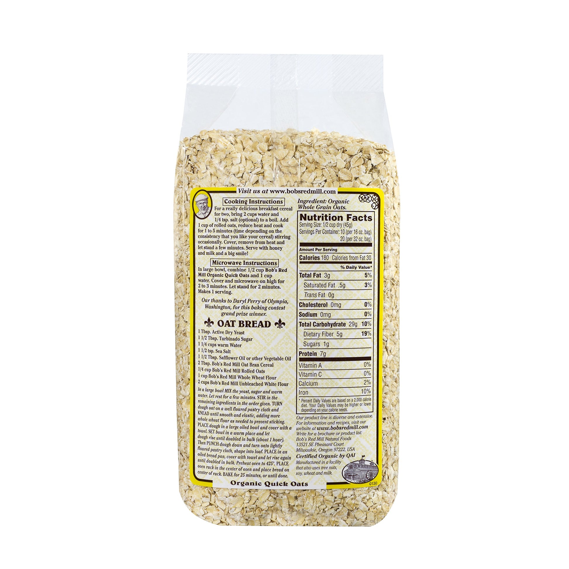 - Q: What are the health benefits of Bob's Red Mill Organic Oats Rolled Quick? A: Bob's Red Mill Organic Oats Rolled Quick are a great source of fiber, providing 7g of protein per serving. They are USDA Certified Organic, gluten-free, vegan, and made from 100% whole grain, making them a nutritious choice for a healthy diet.