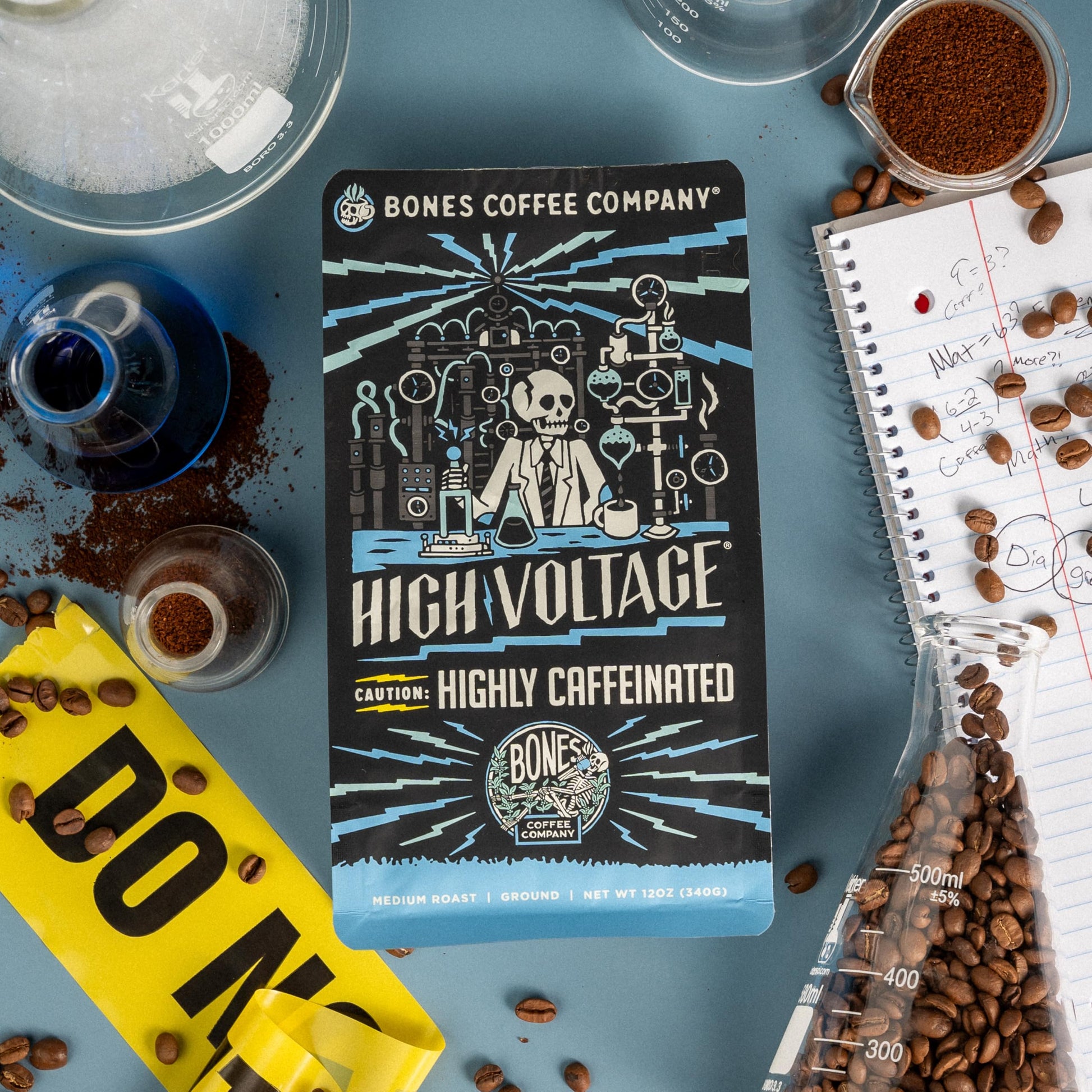 - Q: What makes Bones Coffee Company's High Voltage flavored coffee different from regular coffee? A: Bones Coffee Company's High Voltage flavored coffee is double caffeinated, providing twice the caffeine of average coffee without sacrificing flavor. It features artisan roasted coffee beans that are carefully selected and roasted in small batches for freshness and quality.