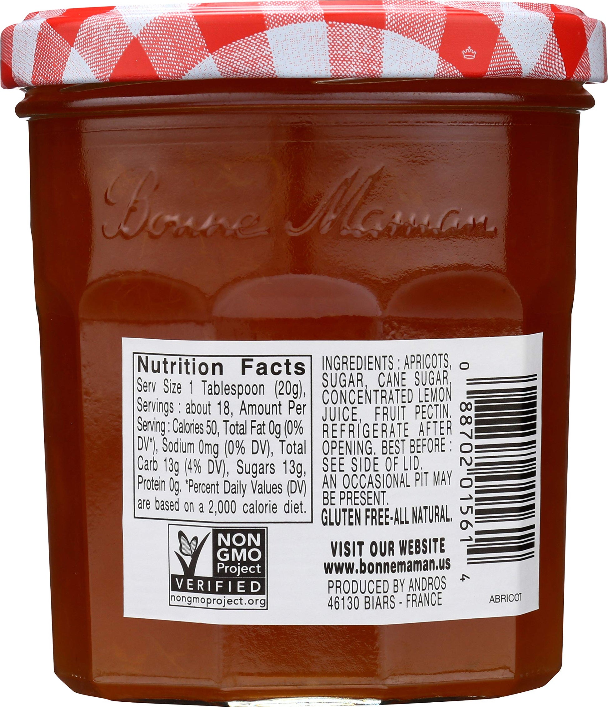 Q: What are the main ingredients in Bonne Maman Apricot Preserves?A: Bonne Maman Apricot Preserves are made from high-quality apricots, sugar, and fruit pectin. They contain no artificial preservatives, colorings, or concentrates, ensuring a natural and delicious flavor.