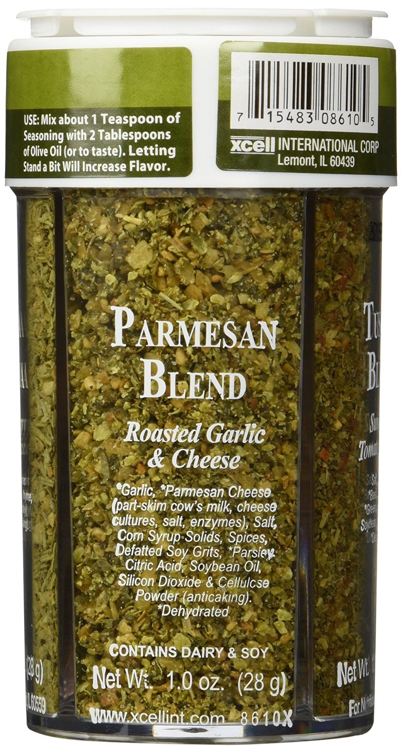 Dean Jacob's Bread Dipping Seasonings, 4.0 oz The essence of four regions of Italy famous for their flavorful cuisines is captured in this collection of four distinct blends of seasonings. Presented in the large signature, four compartment jar, Sicilian Blend 1oz (Traditional), Tuscany Blend 1oz (Sundried Tomato & Basil), Parmesan Blend 1oz (Roasted Garlic & Cheese) and Rosa Maria Blend 1oz (Rosemary & Garlic). Blend with Cold Pressed Extra Virgin Olive Oil and enjoy or enhance the flavors of your favorite recipes.
