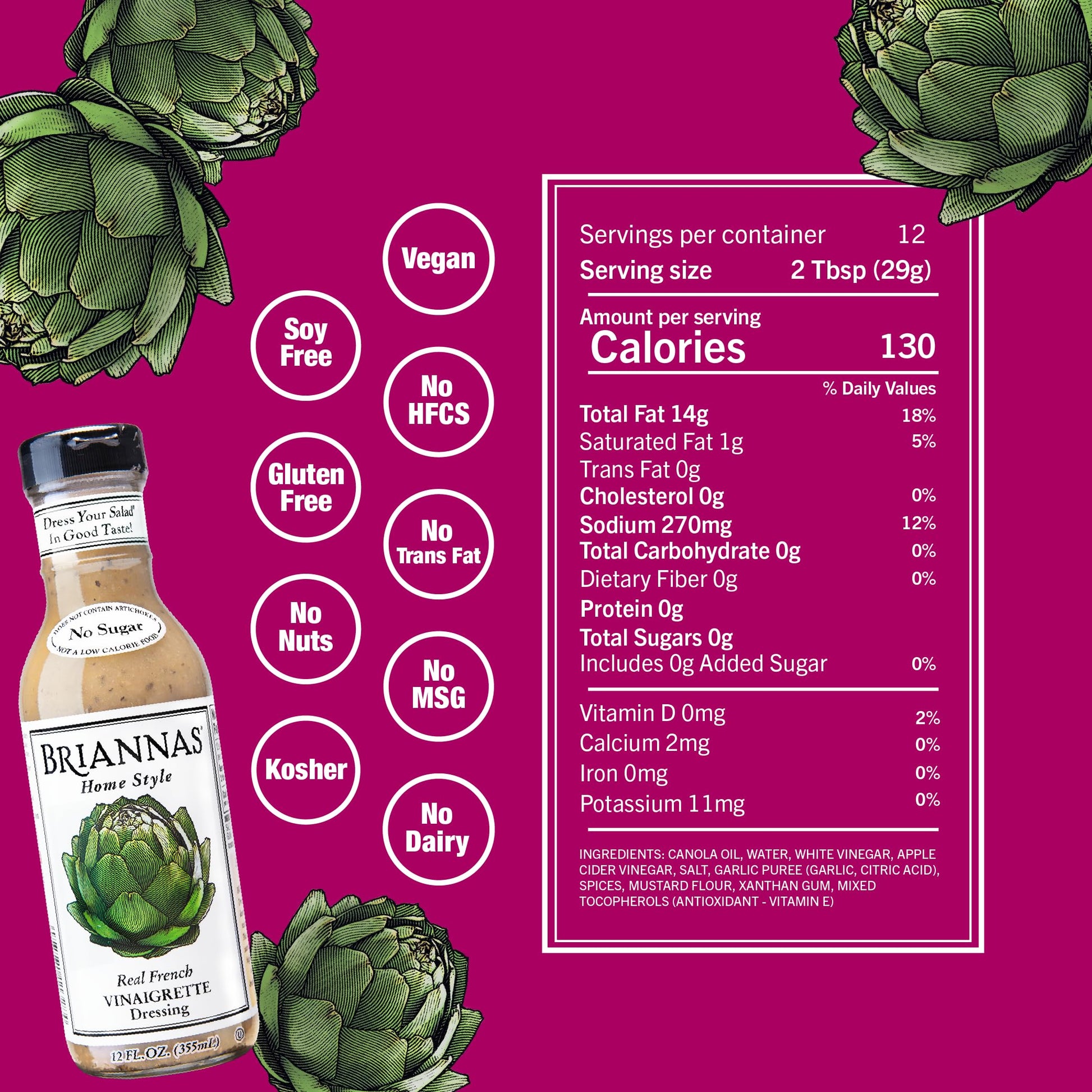 Q: What ingredients are used in BRIANNAS Real French Vinaigrette?A: BRIANNAS Real French Vinaigrette is made with premium ingredients, ensuring a delicious taste. It is gluten-free, kosher, vegan, and contains no added sugar.
