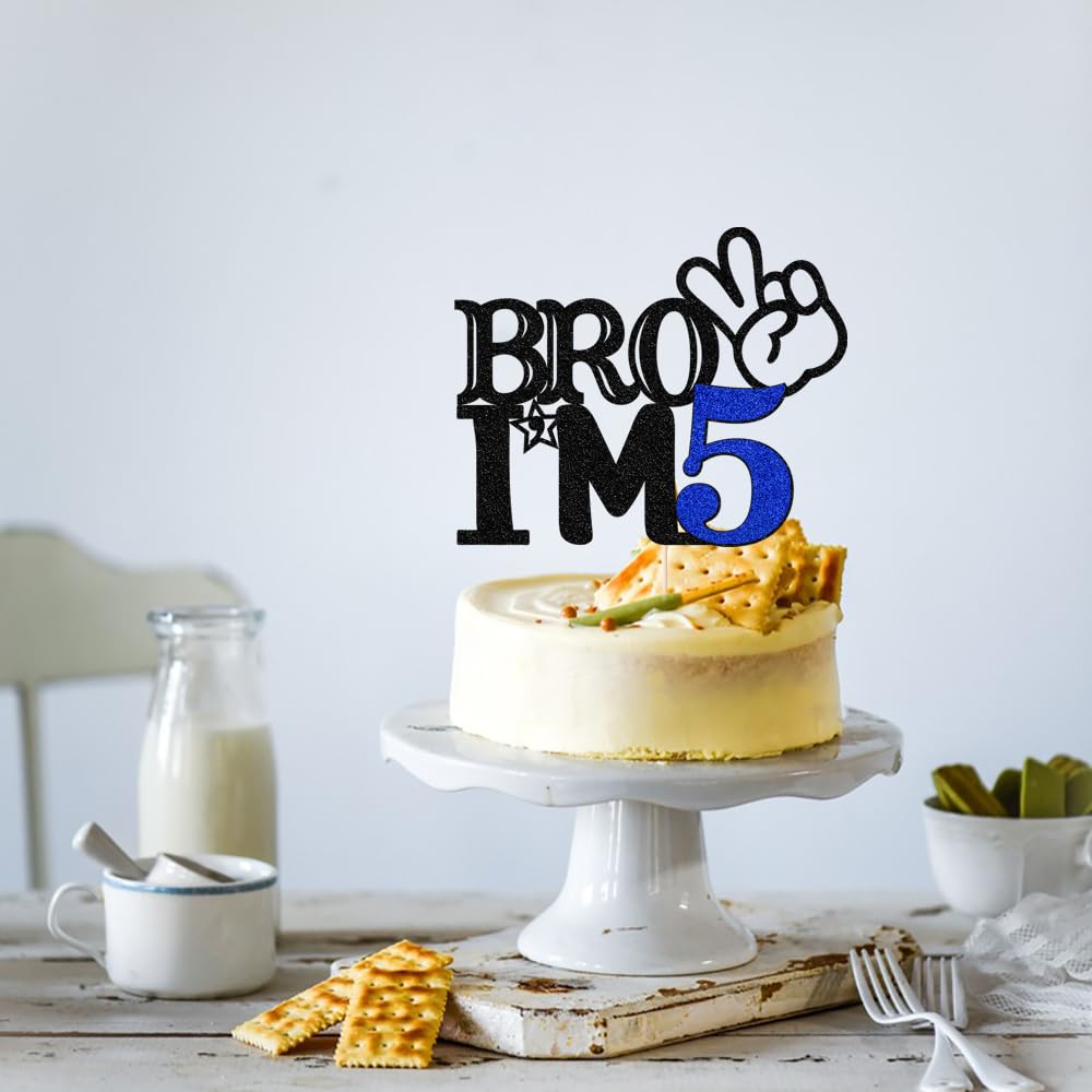 Q: What materials are used in the Bro I'm 5 Cake Topper?A: The Bro I'm 5 Cake Topper is made from premium glitter card materials that are environmentally friendly, safe, and non-toxic, ensuring a safe decoration for your child's birthday cake.