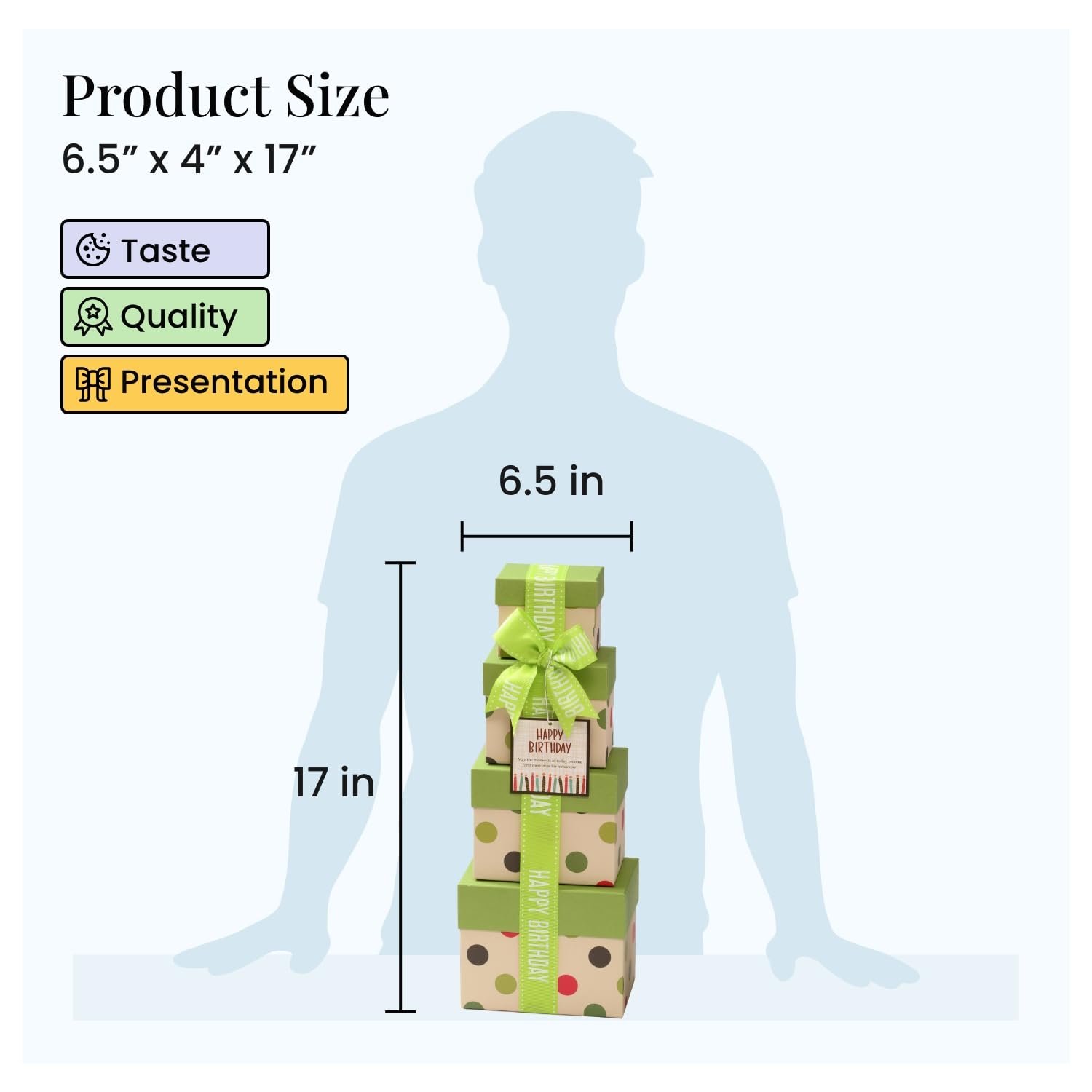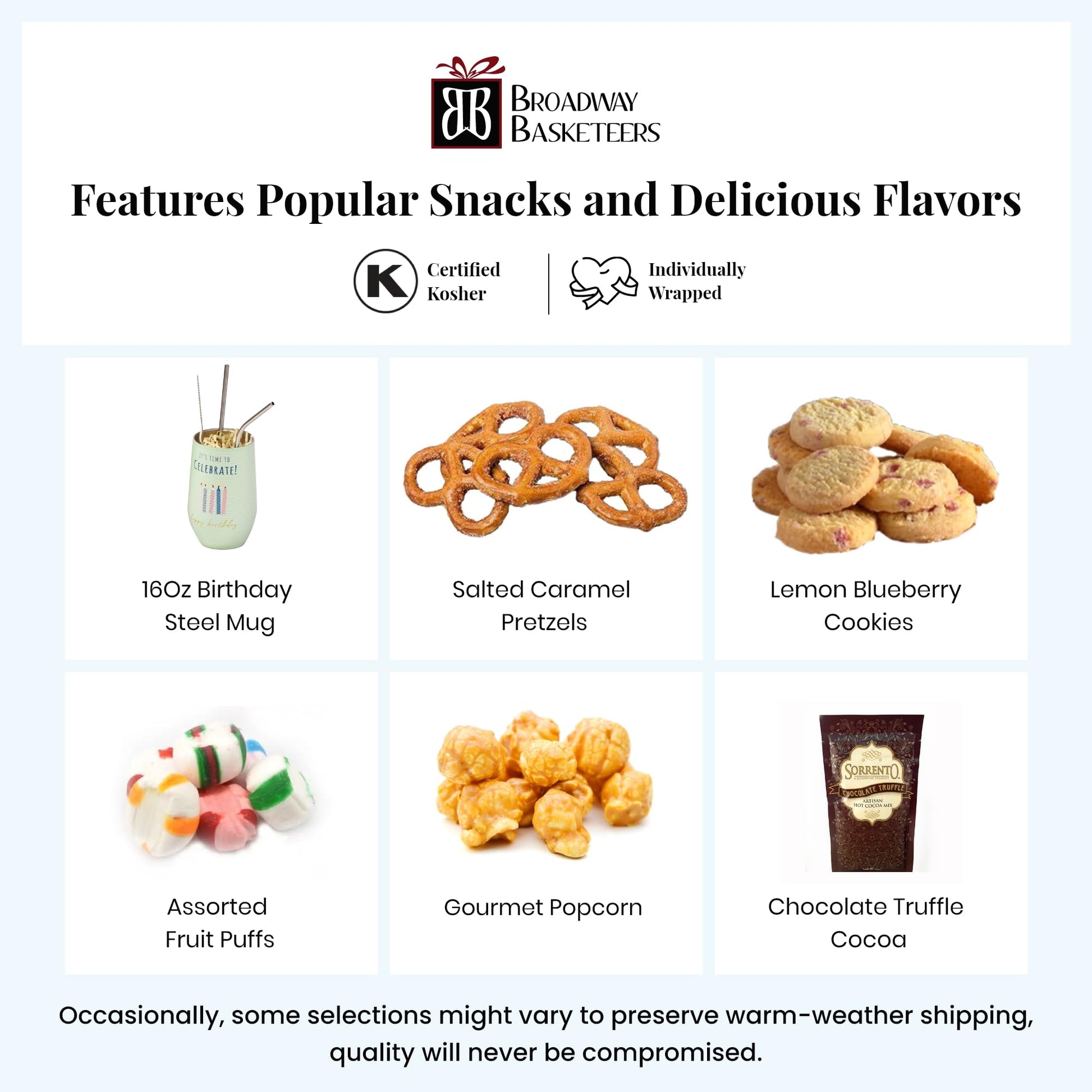 - Q: What items are included in the Broadway Basketeers Birthday Gift Basket Tower? A: The Broadway Basketeers Birthday Gift Basket Tower includes a large 16oz insulated birthday mug, cocoa, yogurt pretzels, popcorn, various sweets, and a 2 lbs assortment of popular snacks, making it a delightful gift for any birthday celebration.