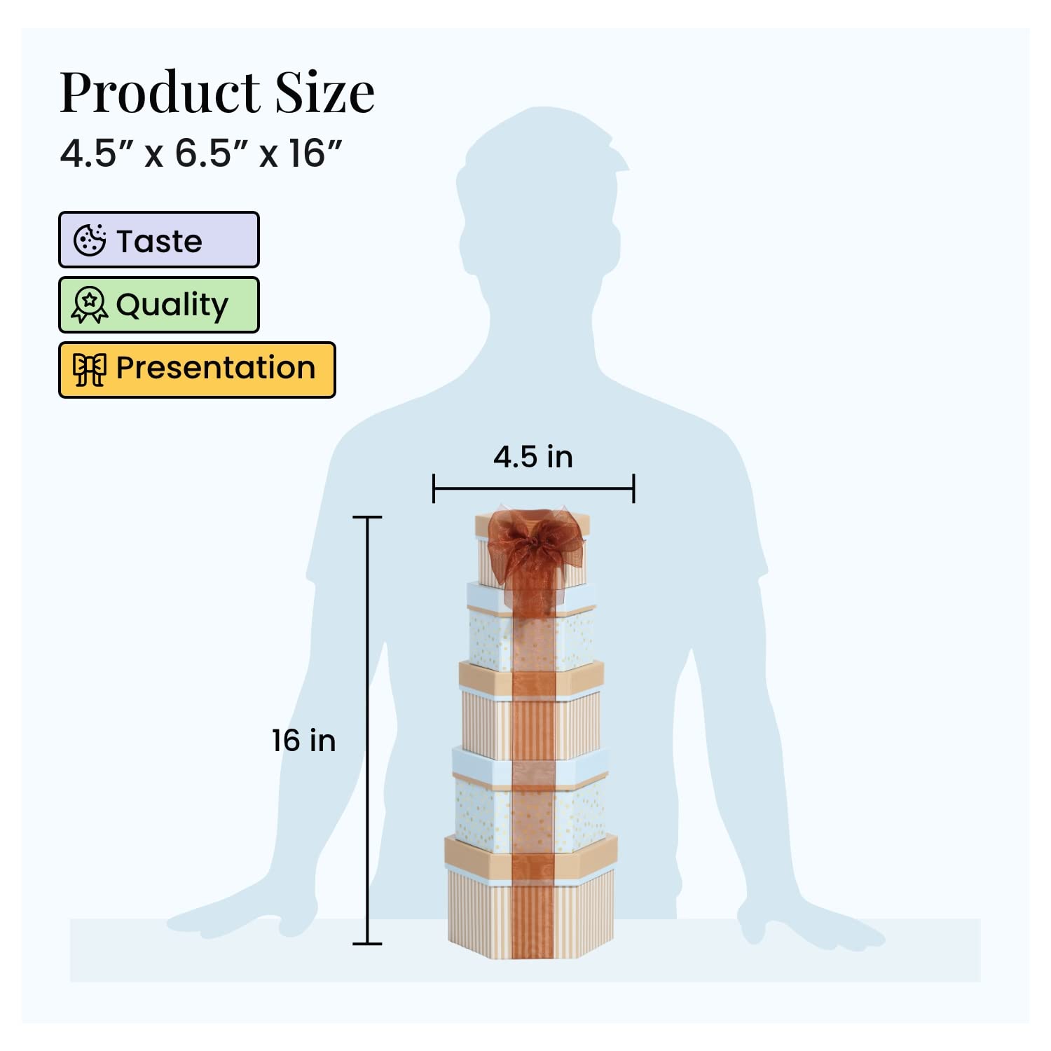 This unique 5 box gift tower comes with a vast assortment of chocolates and goodies. Perfect as a Corporate gift, Birthday gift, or Just because. Gift Includes chocolate chip cappuccino cookies, soft vanilla caramels, gourmet popcorn, sweet & savory snack mix, and so much more!