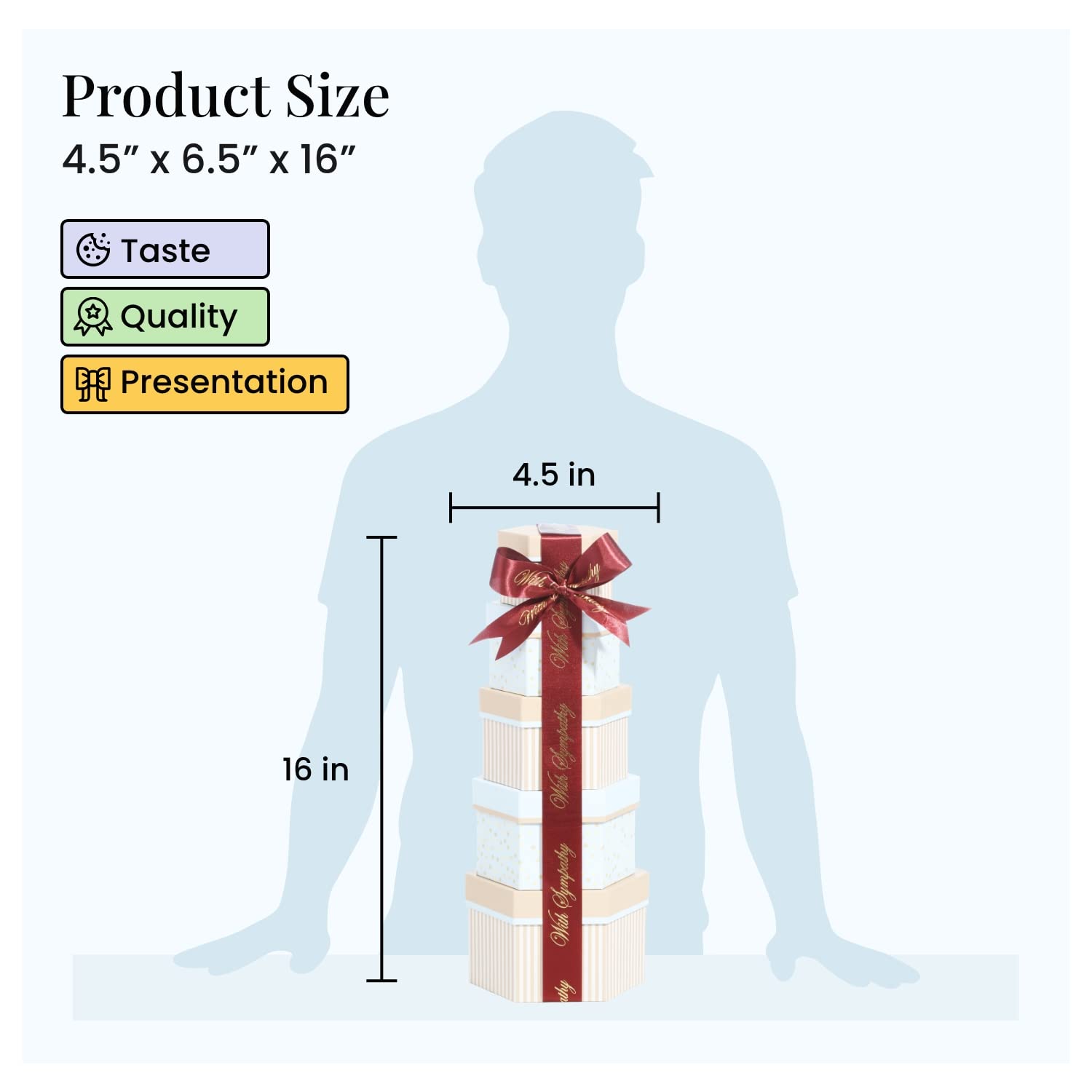 This sympathy 5 box gift tower comes with a vast assortment of chocolates and goodies. Perfect as a condolence or shiva gift. Gift basket includes: gourmet caramel popcorn, creme brulee trail mix, mint chocolate chip cookies and much more!