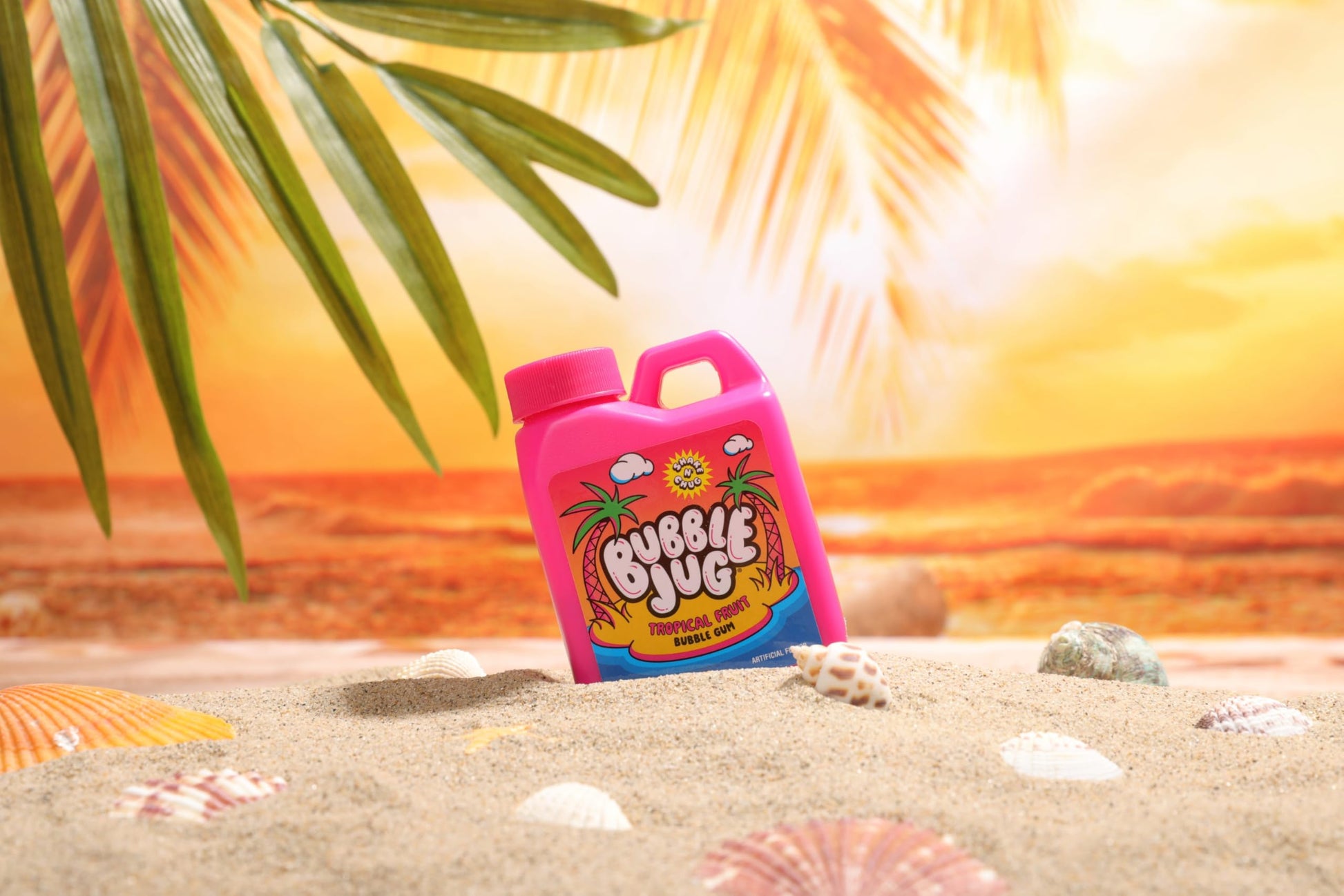 Q: What is Bubble Jug and how does it work?A: Bubble Jug is a nostalgic bubble gum that transforms from powder into gum. Simply shake out the powder from the reusable container, and as you chew, it turns into a delicious gum bursting with tropical fruit flavor.