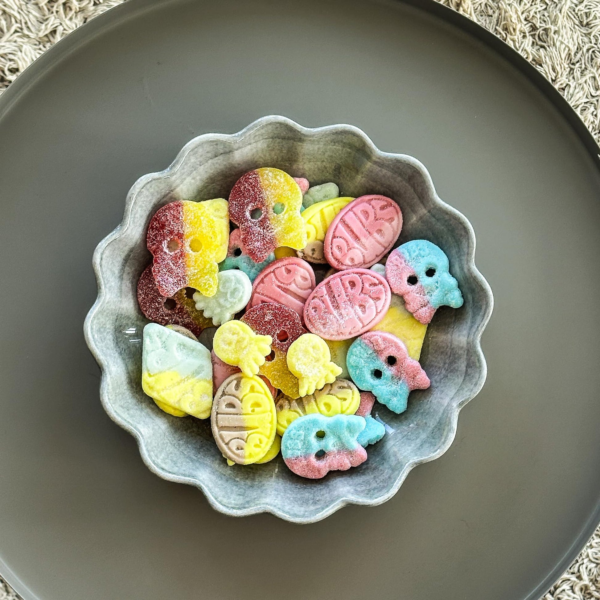 Q: What types of gummies are included in the Bubs Swedish Candy Mix?A: The Bubs Swedish Candy Mix features a delightful variety of sweet and sour gummies, including fun shapes such as big ovals and skulls, providing a unique taste experience.