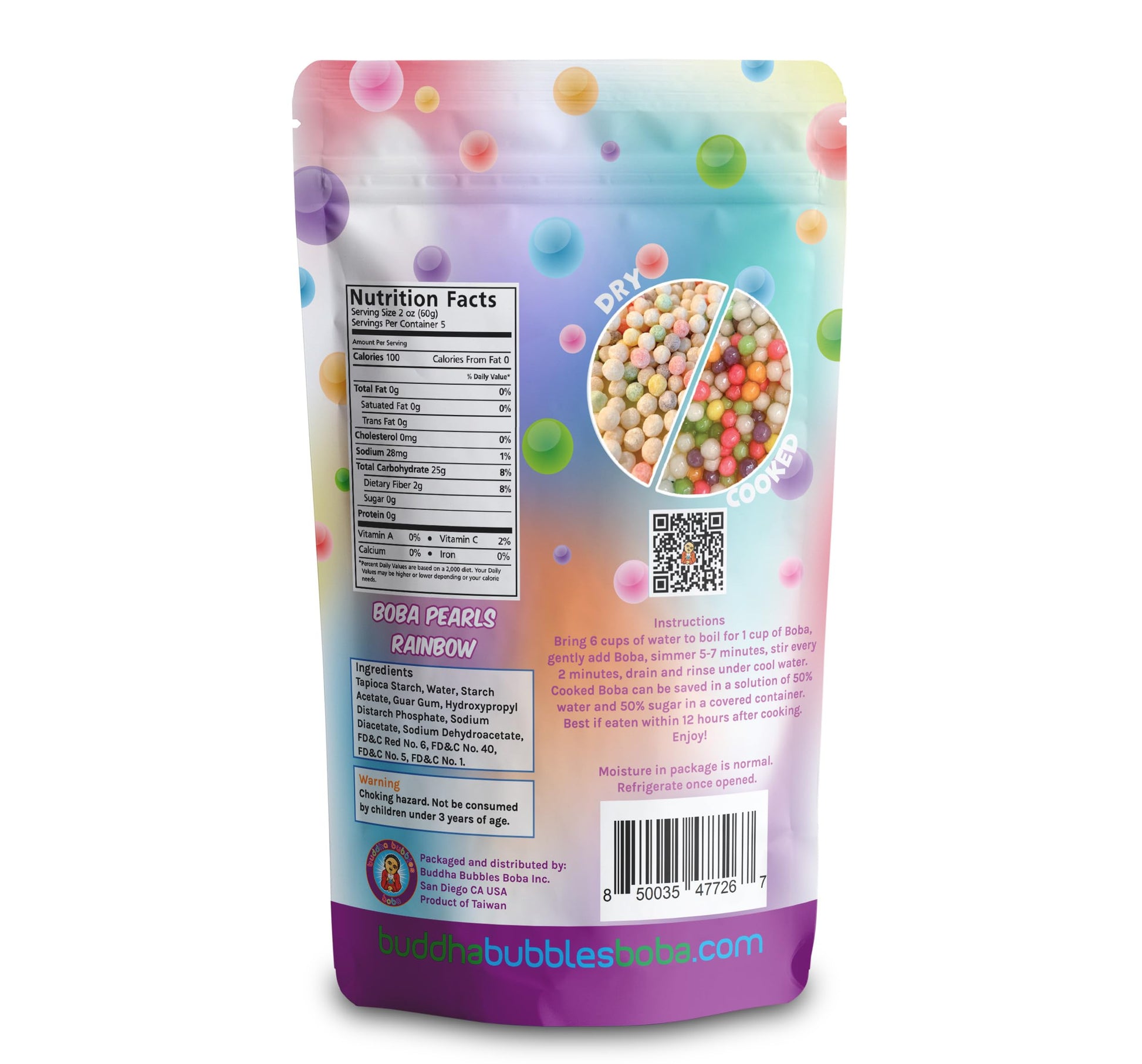 - Q: What is the nutritional content of Rainbow Boba Pearls? A: Rainbow Boba Pearls are primarily made of tapioca, which is high in carbohydrates and low in protein and fat. For specific nutritional details, it is advisable to check the packaging.