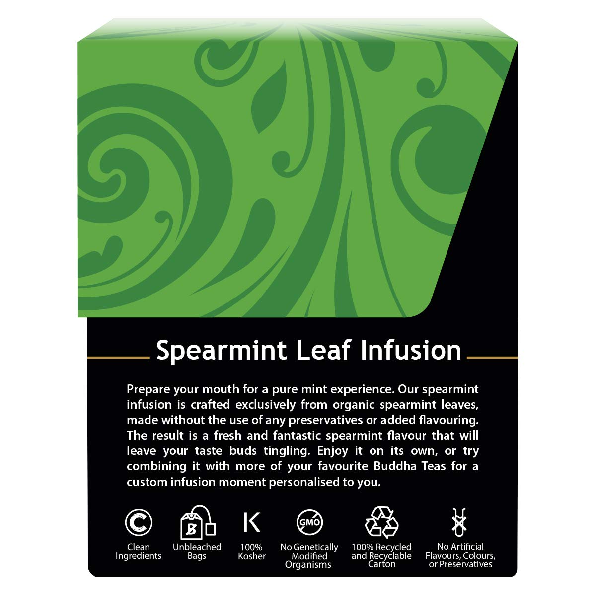 Q: What are the main ingredients in Buddha Teas Organic Spearmint Tea?A: Buddha Teas Organic Spearmint Tea is made from high-quality organic spearmint leaves. This ensures a fresh, flavorful tea experience.