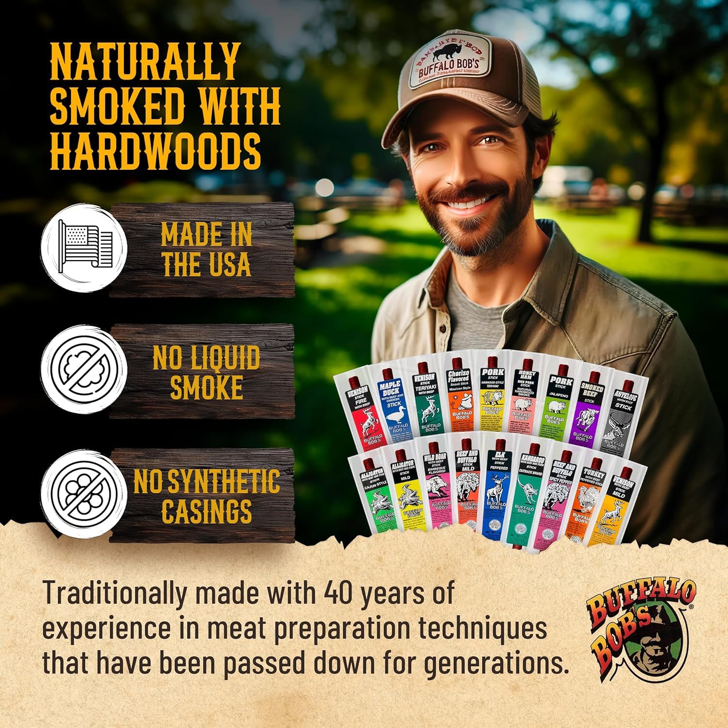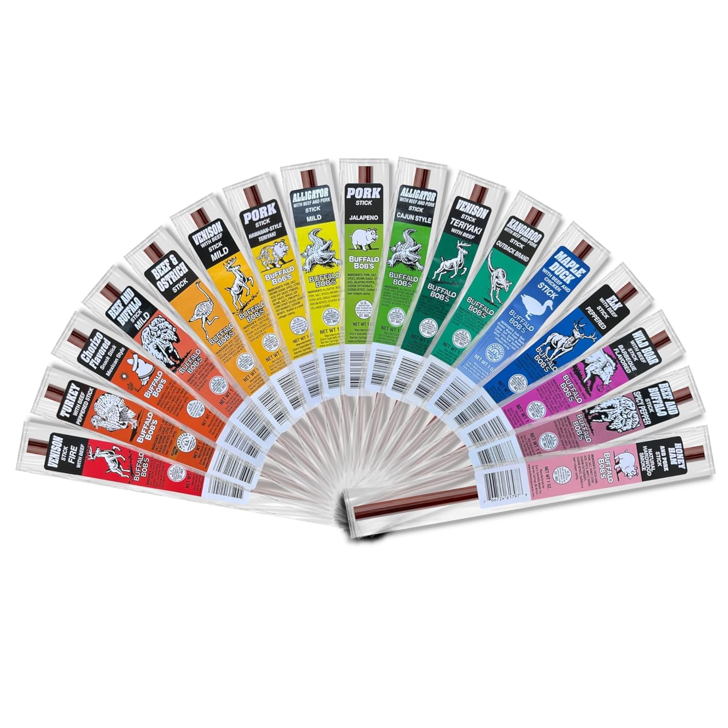 Experience the ultimate flavor adventure with Buffalo Bob's 20 Piece Sampler Pack! This curated selection is perfect for meat lovers and adventurous eaters who crave a unique snacking experience. This sampler pack brings together a variety of mouthwatering jerky and snack sticks, showcasing the bold and diverse tastes for which Buffalo Bob's is renowned. Each pack features an assortment of flavors, including savory beef jerky, zesty venison sticks, and exotic options like wild boar and elk.